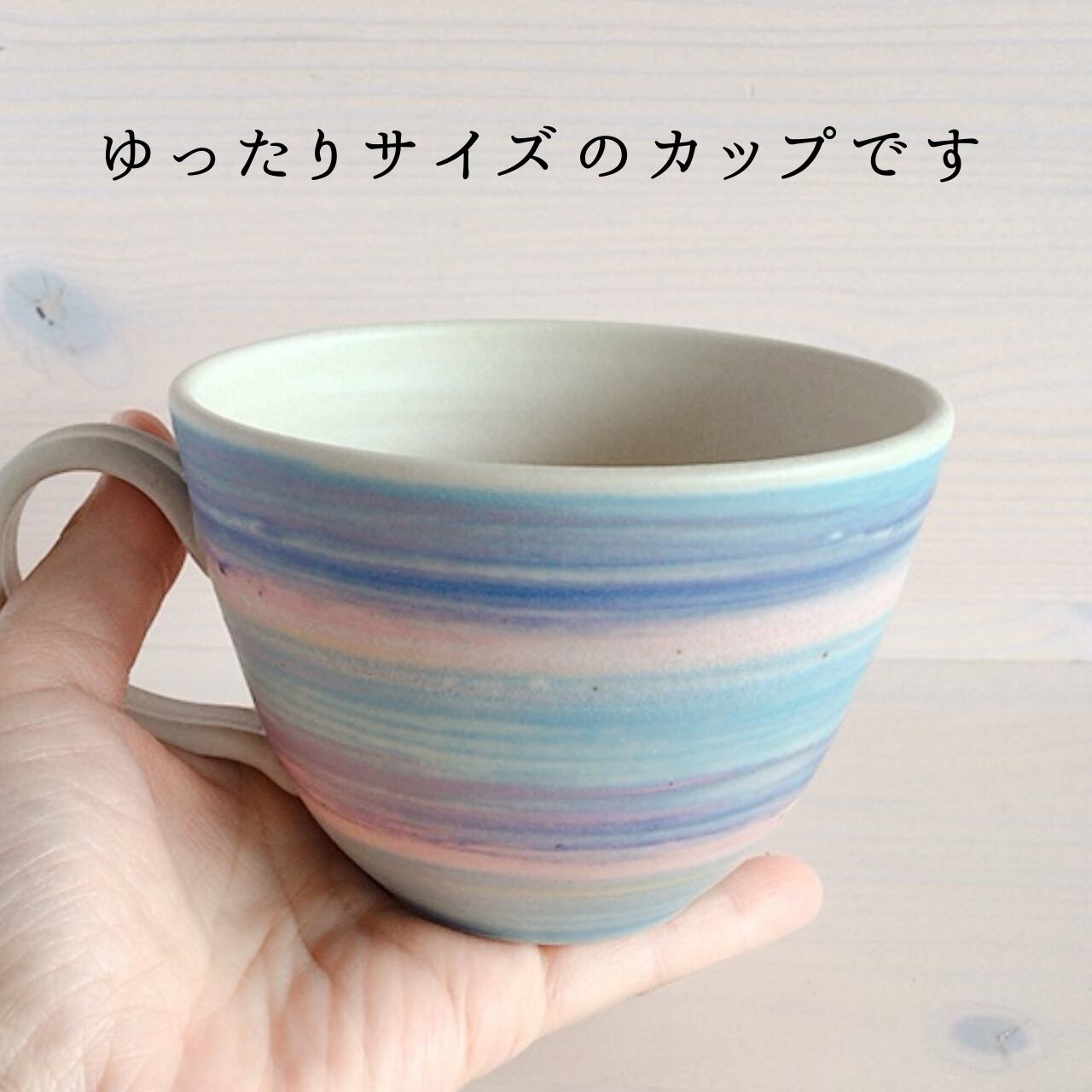 2種類の土で生みマーブル出すマーブル模様が美しいカップは青、緑、黄色で3色ご用意しております。その他、水彩画のように優しい印象のフリーカップ、ターコイズの釉薬のグラデーションが美しいカップもございます。ぜひ合わせてご覧ください。