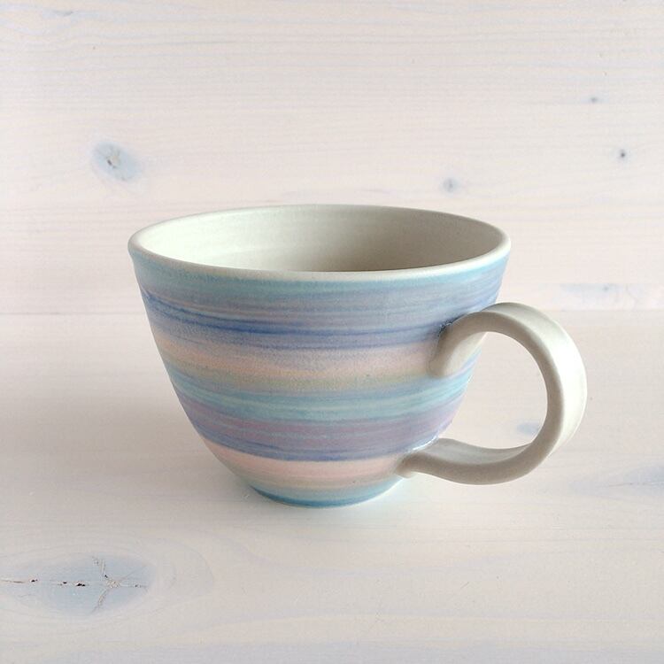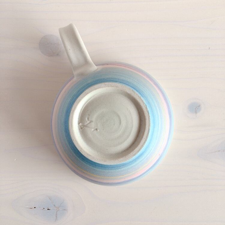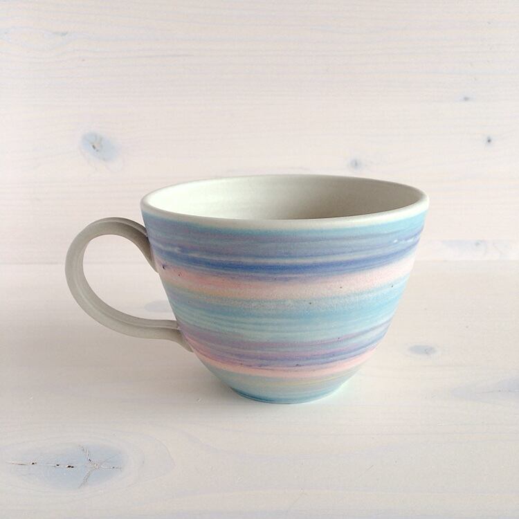 南城市にある陶工房ippoの化粧掛けマグカップ。ゆったりサイズなのでカフェオレボウル、スープカップとしてもお使い頂けます。水彩画のように繊細で優しい色たちが、食卓を明るくしてくれます。マットな感触の器です。