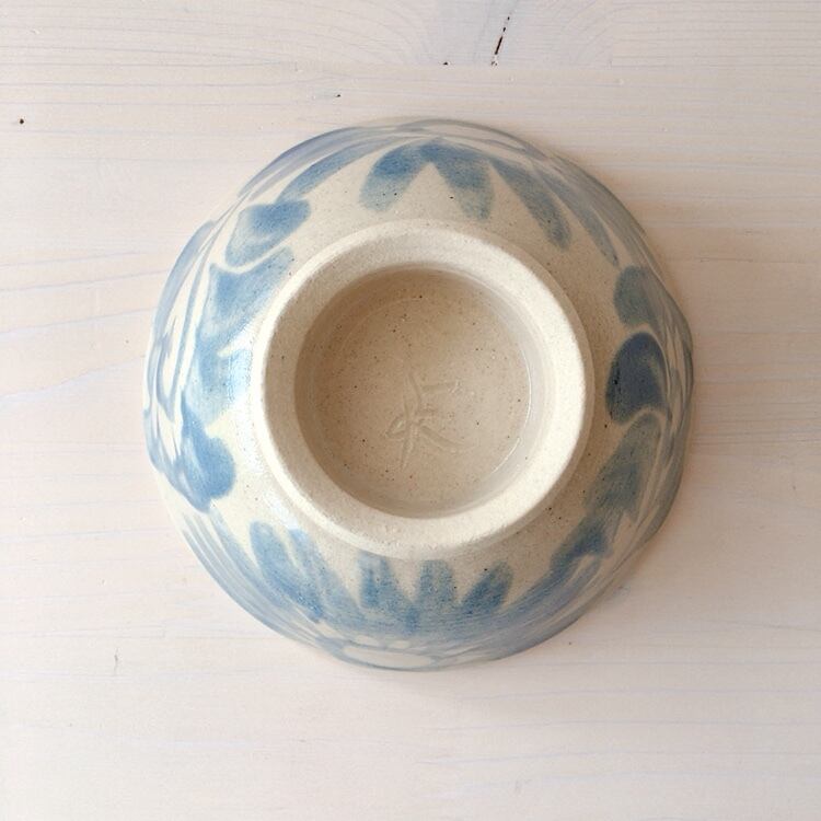 やちむんでは珍しい華やかな水色を使って、柔らかに描かれた唐草模様が華やかな器です。