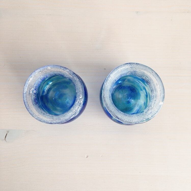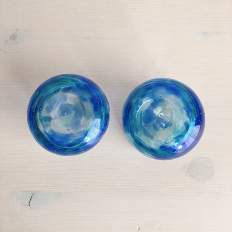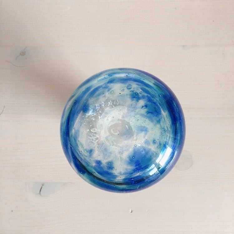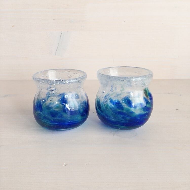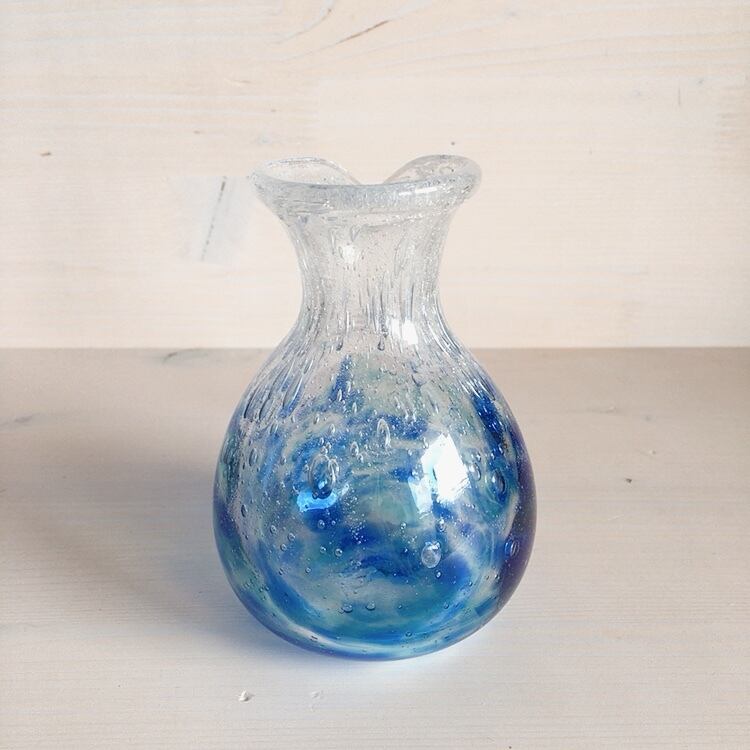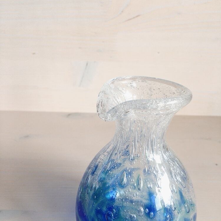 少しぽってりとした造りで、濃い青とエメラルドグリーンが優しく混ざり、琉球ガラスの特徴でもある泡が施されています。眺めていると、波打ち際で沖縄の海を眺めているようで、波の音が聞こえてきそうです。