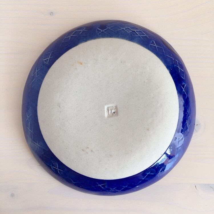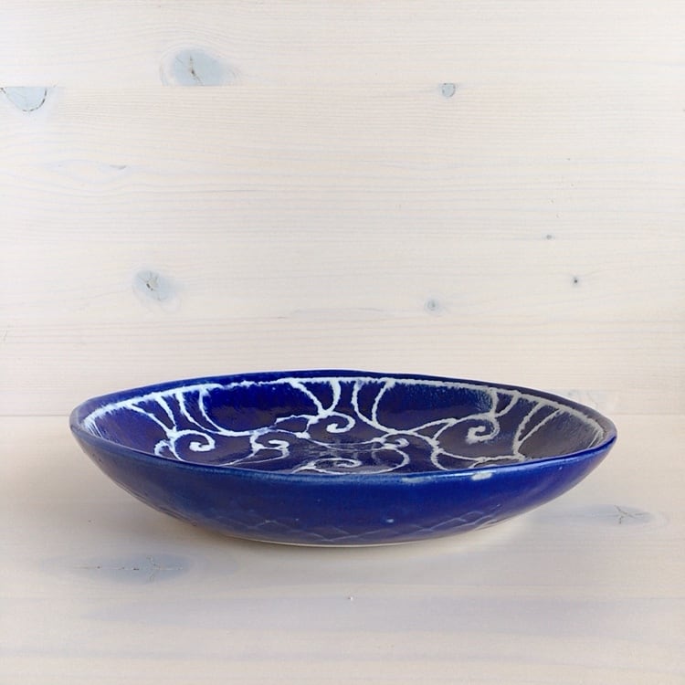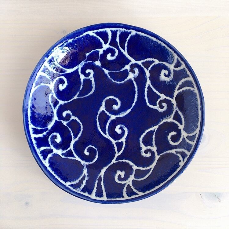 眞正陶房 7寸浅鉢お皿(約21.5cm)アラベスク 青