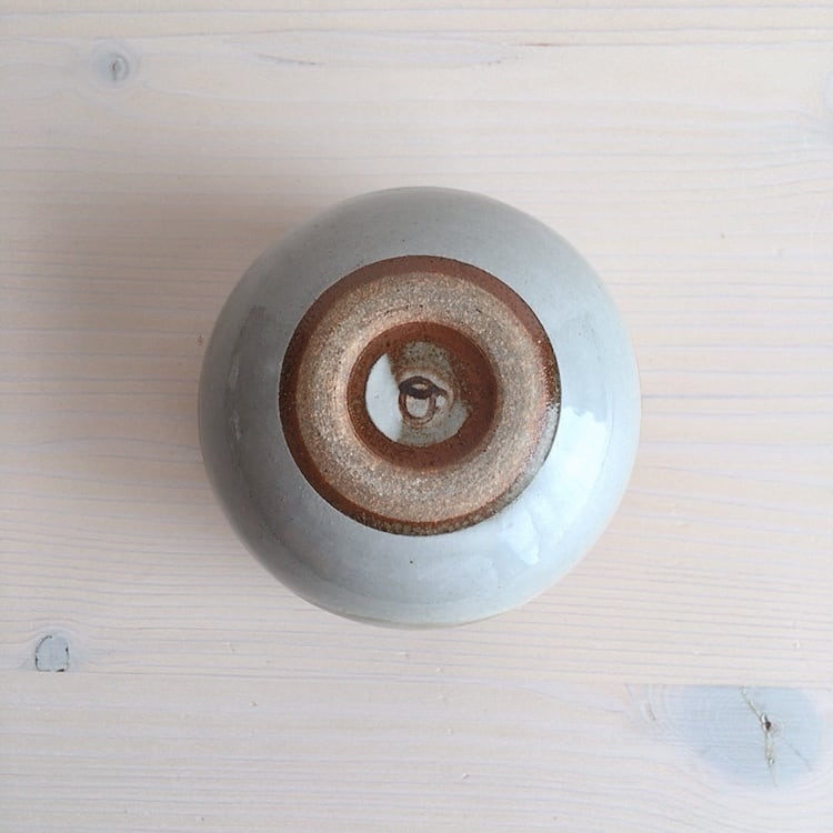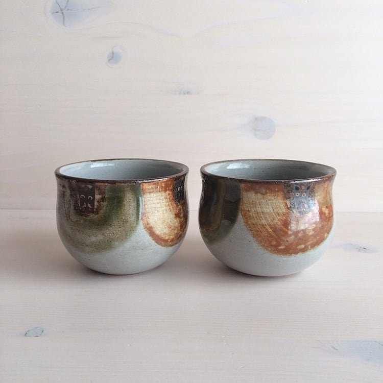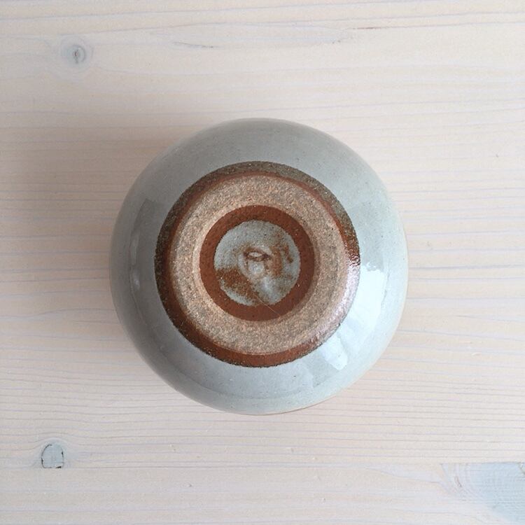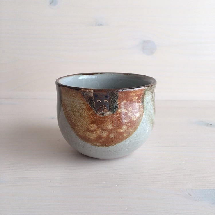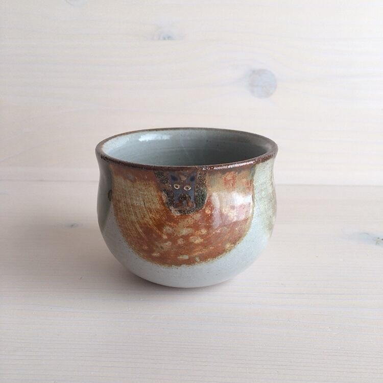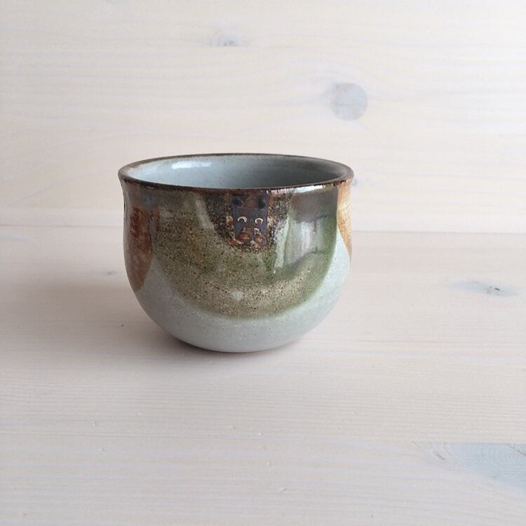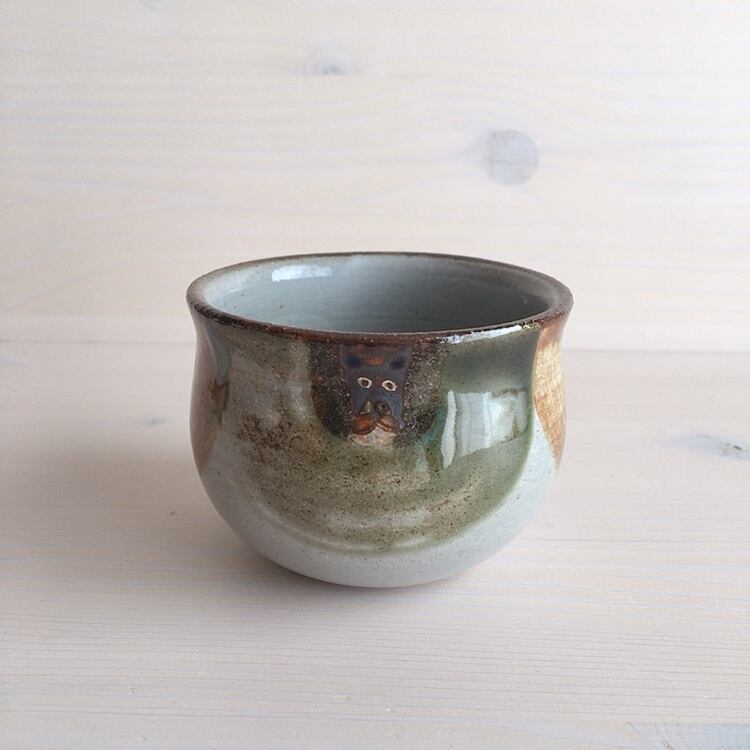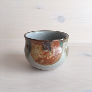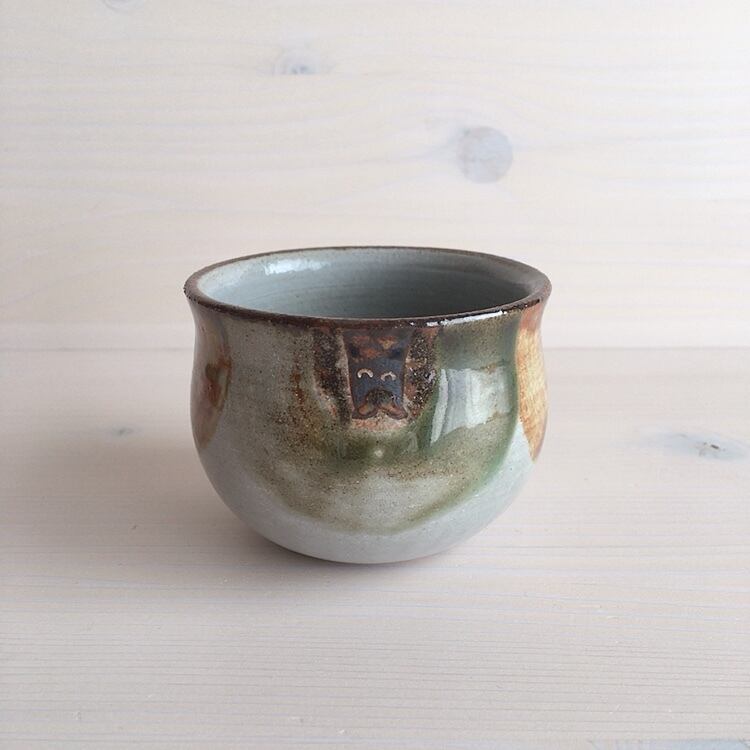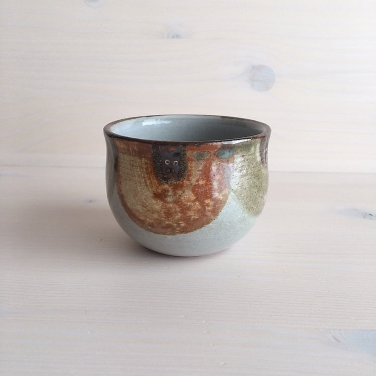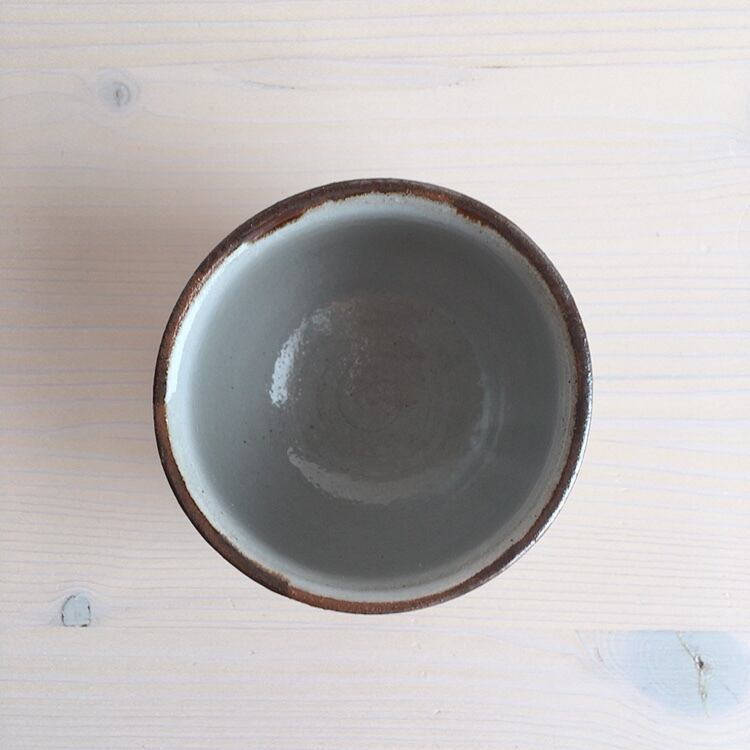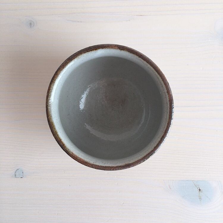 読谷村に工房を構えるおなが家のカップ。こちらはSサイズです。湯呑みとしてはもちろん、店主はスープカップとして、時にはモズク酢をよそって小鉢としても愛用しています。高台はついていませんが、底が厚く作られているので、熱いものを入れても使いやすく工夫されています。