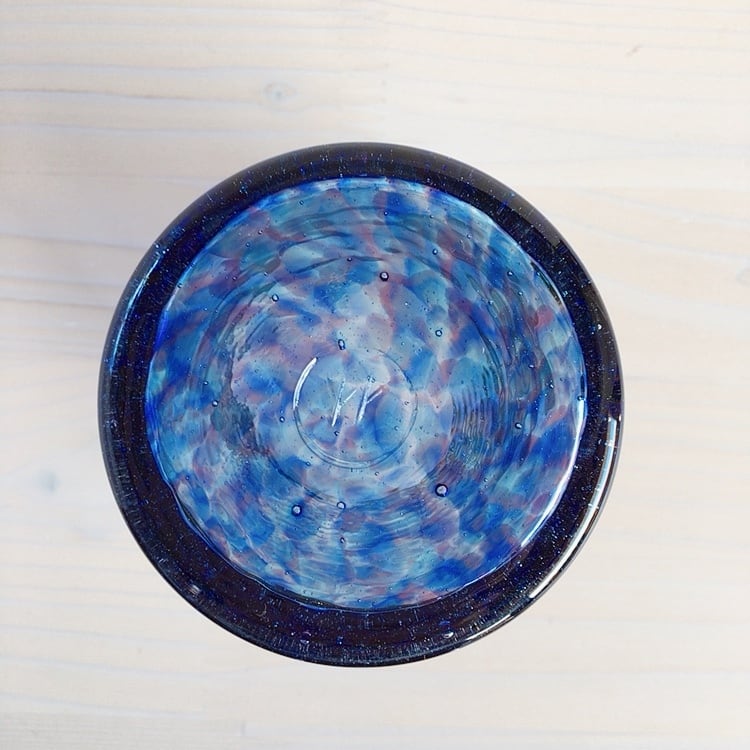 細やかに色が重なり、ガラスならではの美しさが感じられる作品。3色の色ガラスを重ね、色付けの段階で水の中に何度も入れる事によって、このような模様になっていくそう。