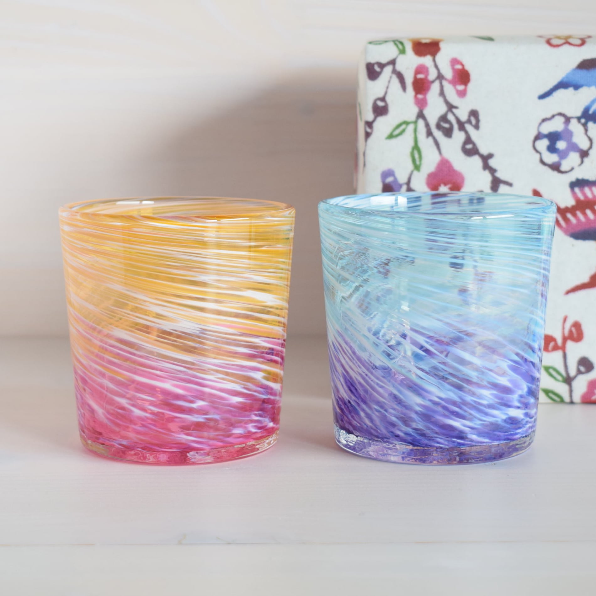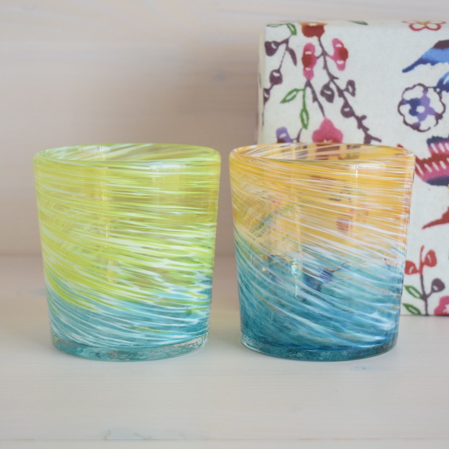 読谷村にある琉球ガラス工房 雫のロックグラス2個をセットにしてギフト用にご用意しました。