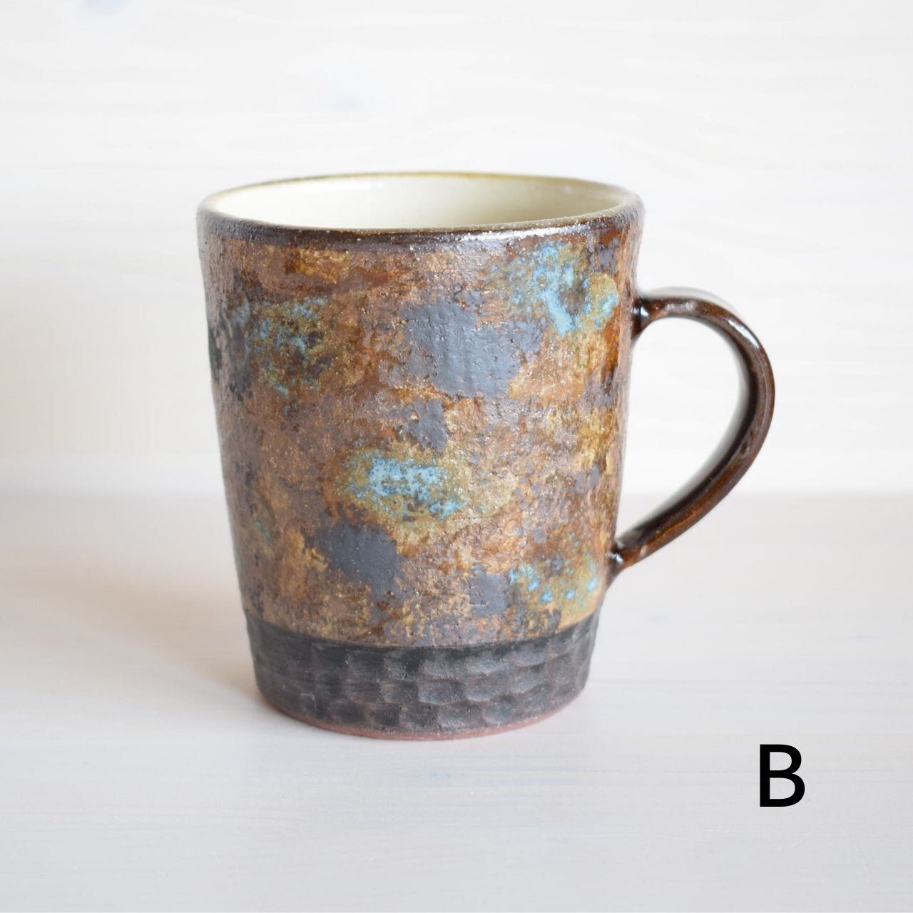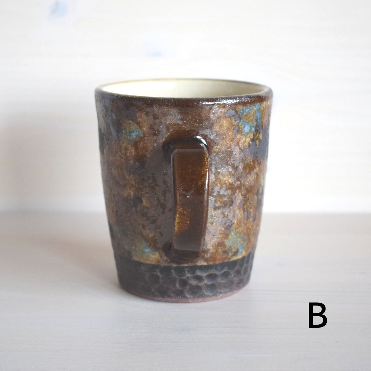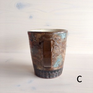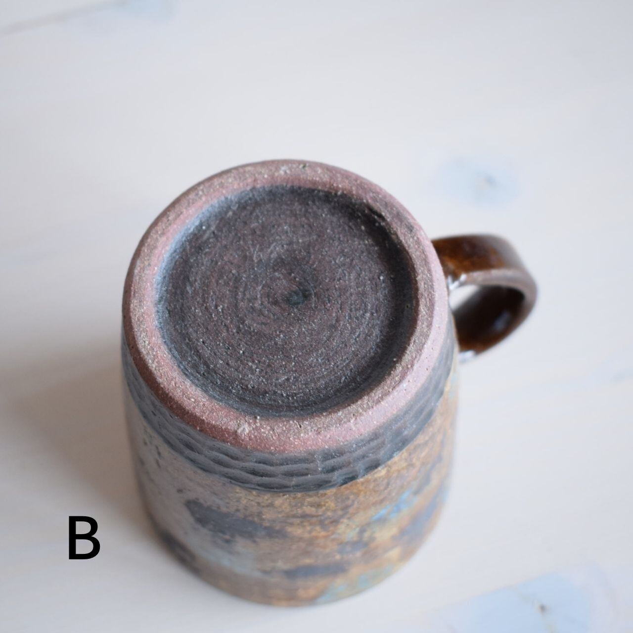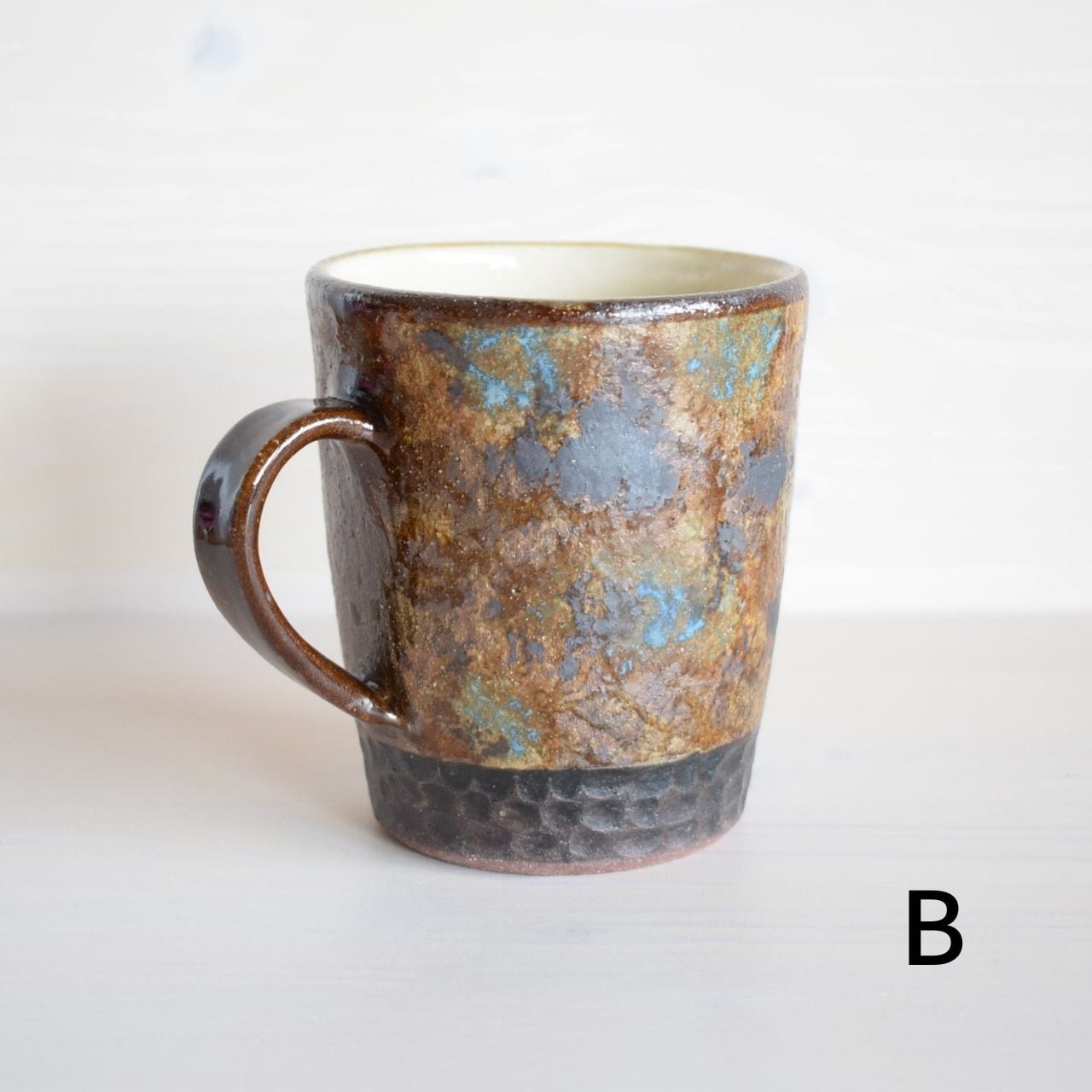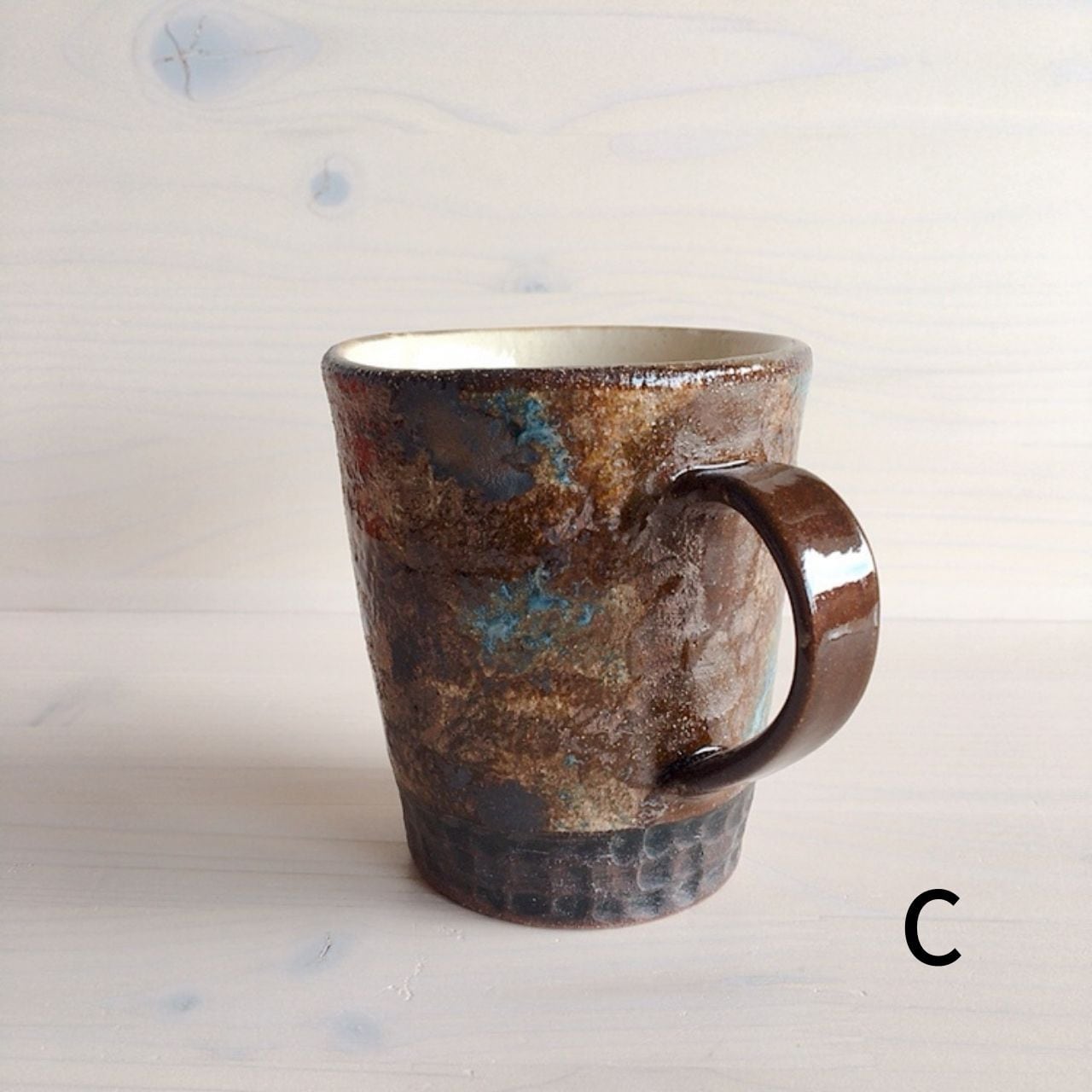 北中城村に工房を構える「sui」のマグカップ。ビール、コーヒー、カフェオレもお楽しみいただけるカップです。飴色の釉薬をベースに、マンガンという少し黒っぽい釉薬、翡翠を重ねてアンティークのような雰囲気をまとっています。マンガン釉薬は使用している間に艶が出て、色合いが少しずつ変わります。ご購入時と少しずつ変わっていくその様子も一緒にお楽しみください。