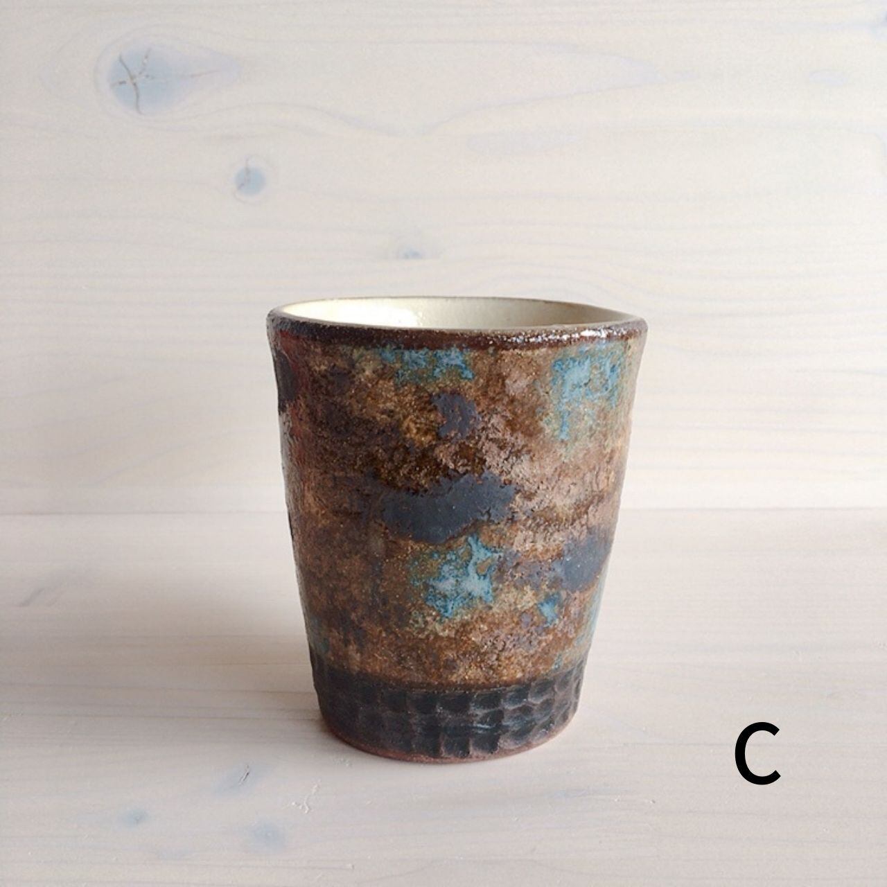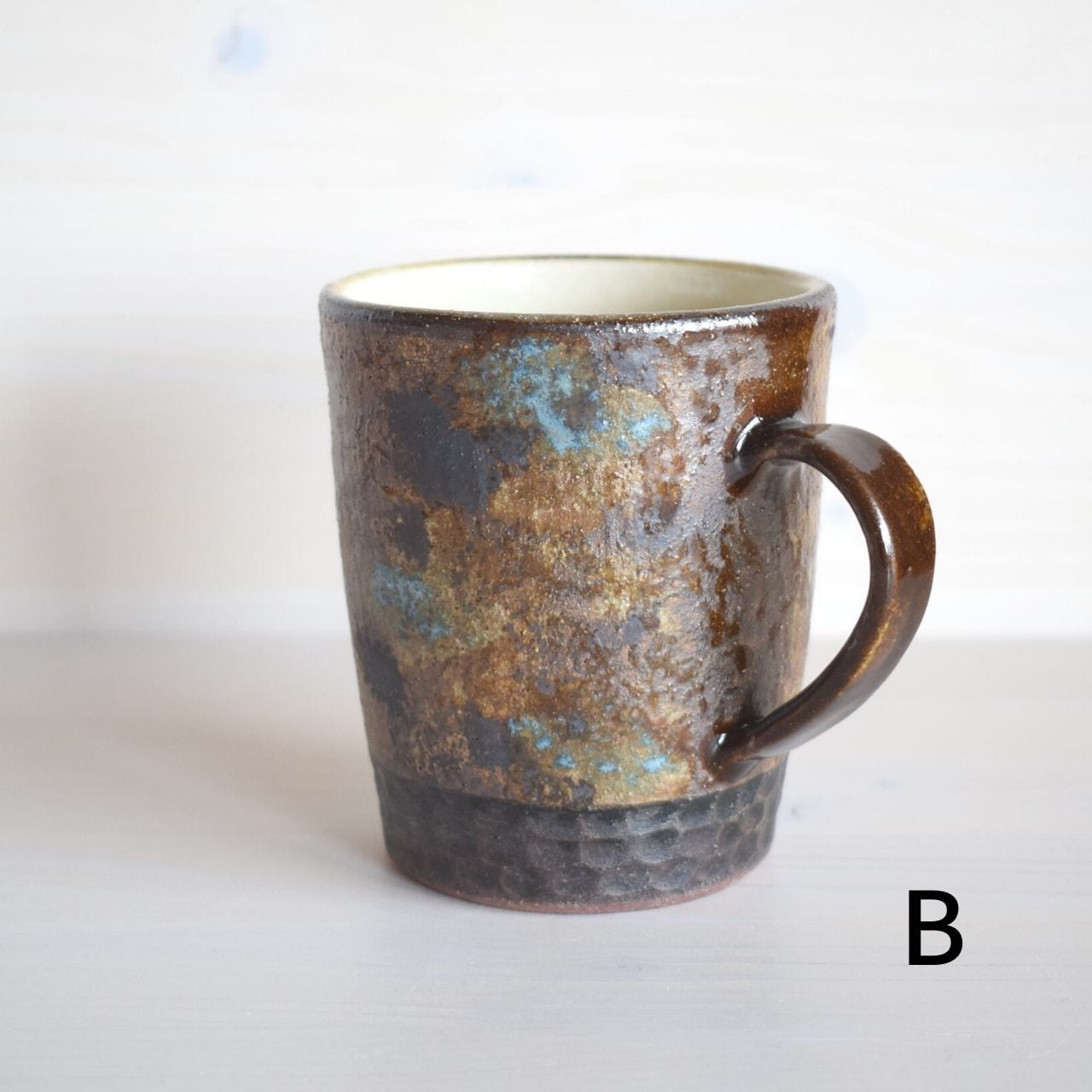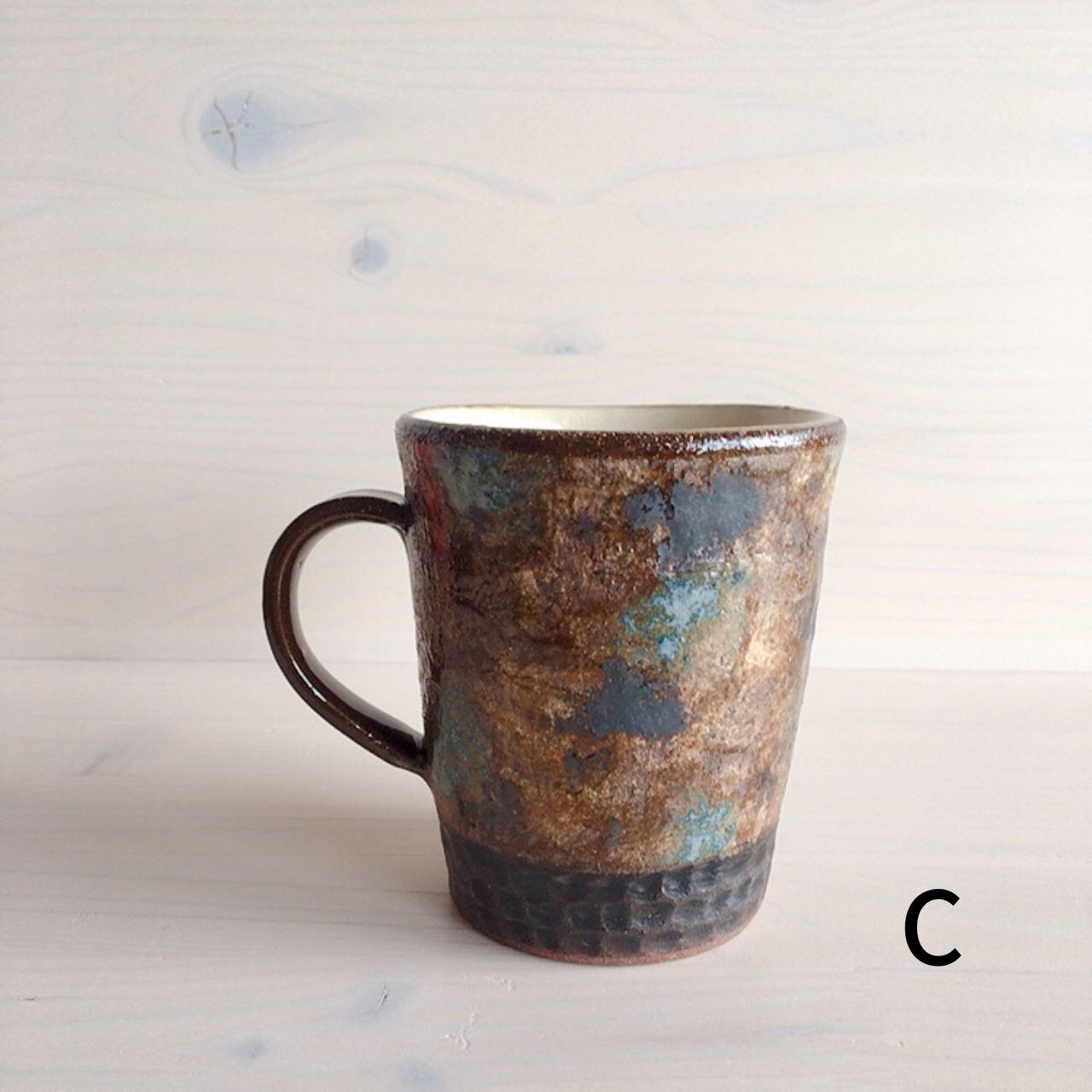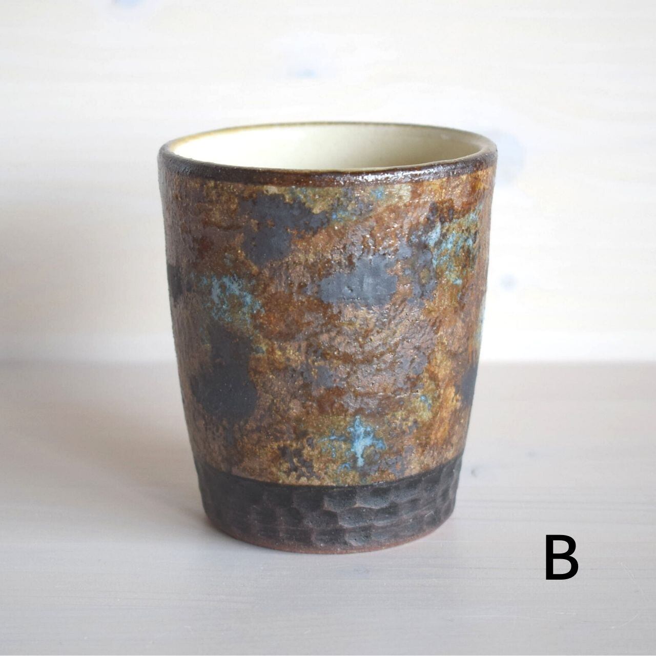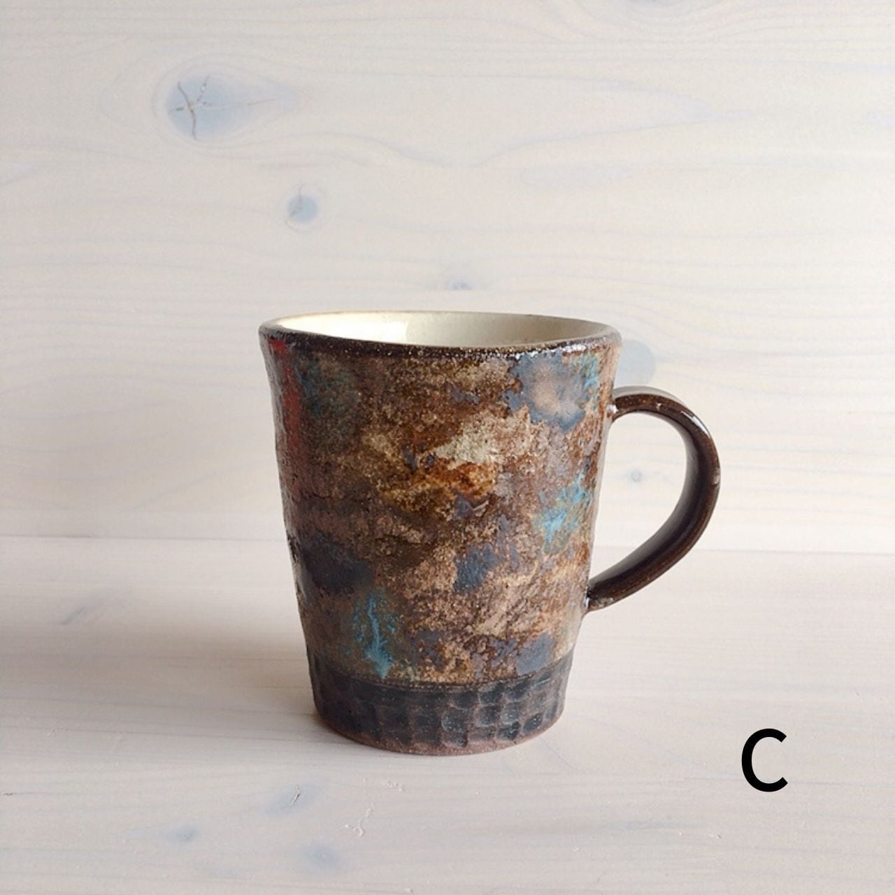北中城村に工房を構える「sui」のマグカップ。ビール、コーヒー、カフェオレもお楽しみいただけるカップです。飴色の釉薬をベースに、マンガンという少し黒っぽい釉薬、翡翠を重ねてアンティークのような雰囲気をまとっています。マンガン釉薬は使用している間に艶が出て、色合いが少しずつ変わります。ご購入時と少しずつ変わっていくその様子も一緒にお楽しみください。