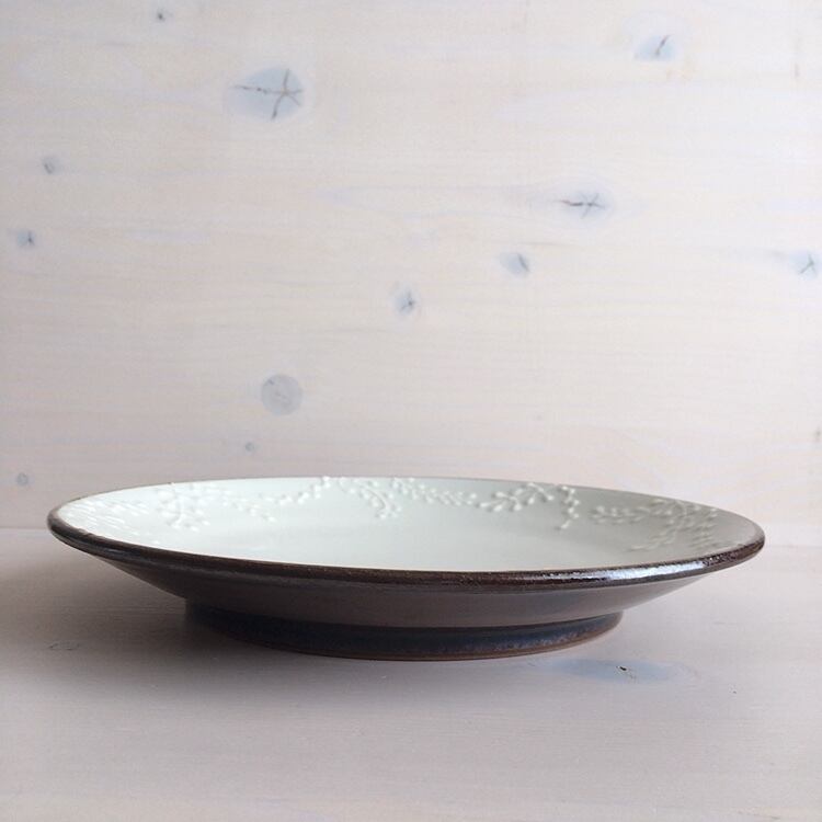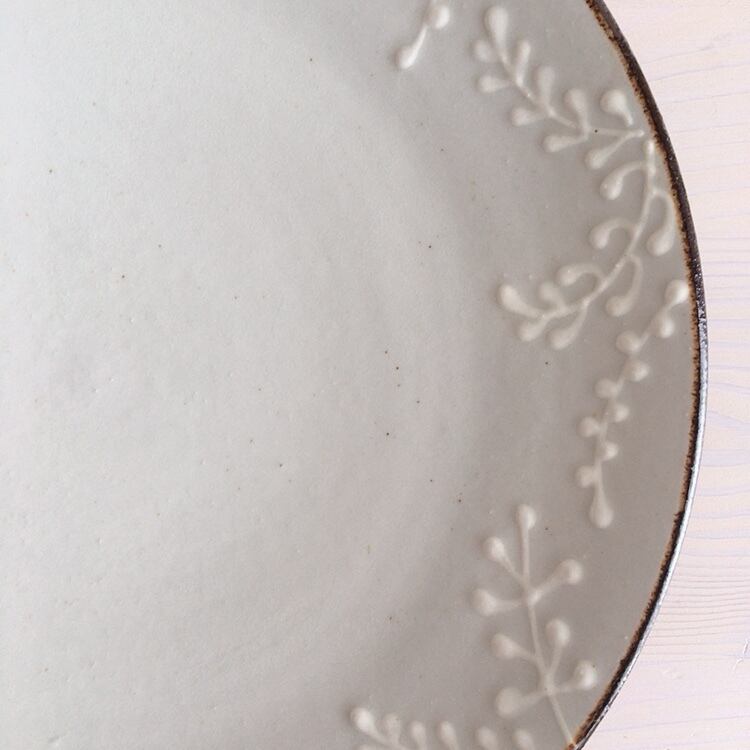 読谷村にある陶器工房「nagaremo」の7.5寸皿です。イッチンという技法で描かれた草木が優しい印象の器。温かみのあるオフホワイト、さとうきびの釉薬を使用することで現れる茶色の点々が素朴な雰囲気で、どんなお料理も引き立ててくれます。低めの高台がついているので、熱々のお料理もよそいやすく、洗った後の水はけもよさそうです。