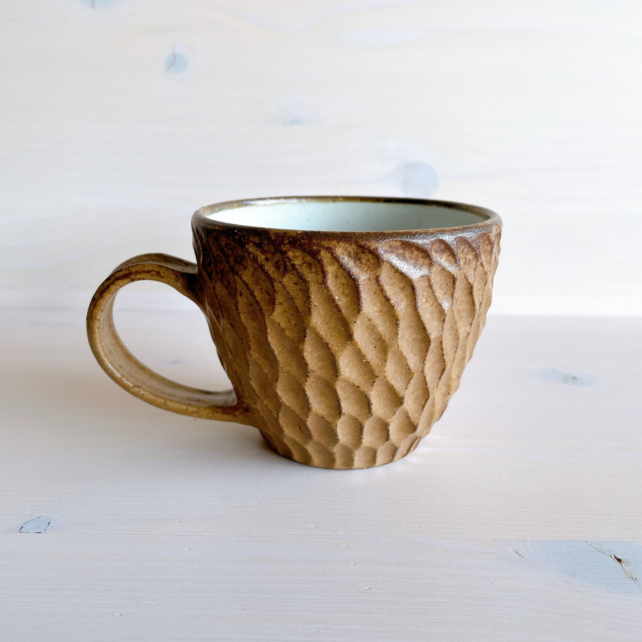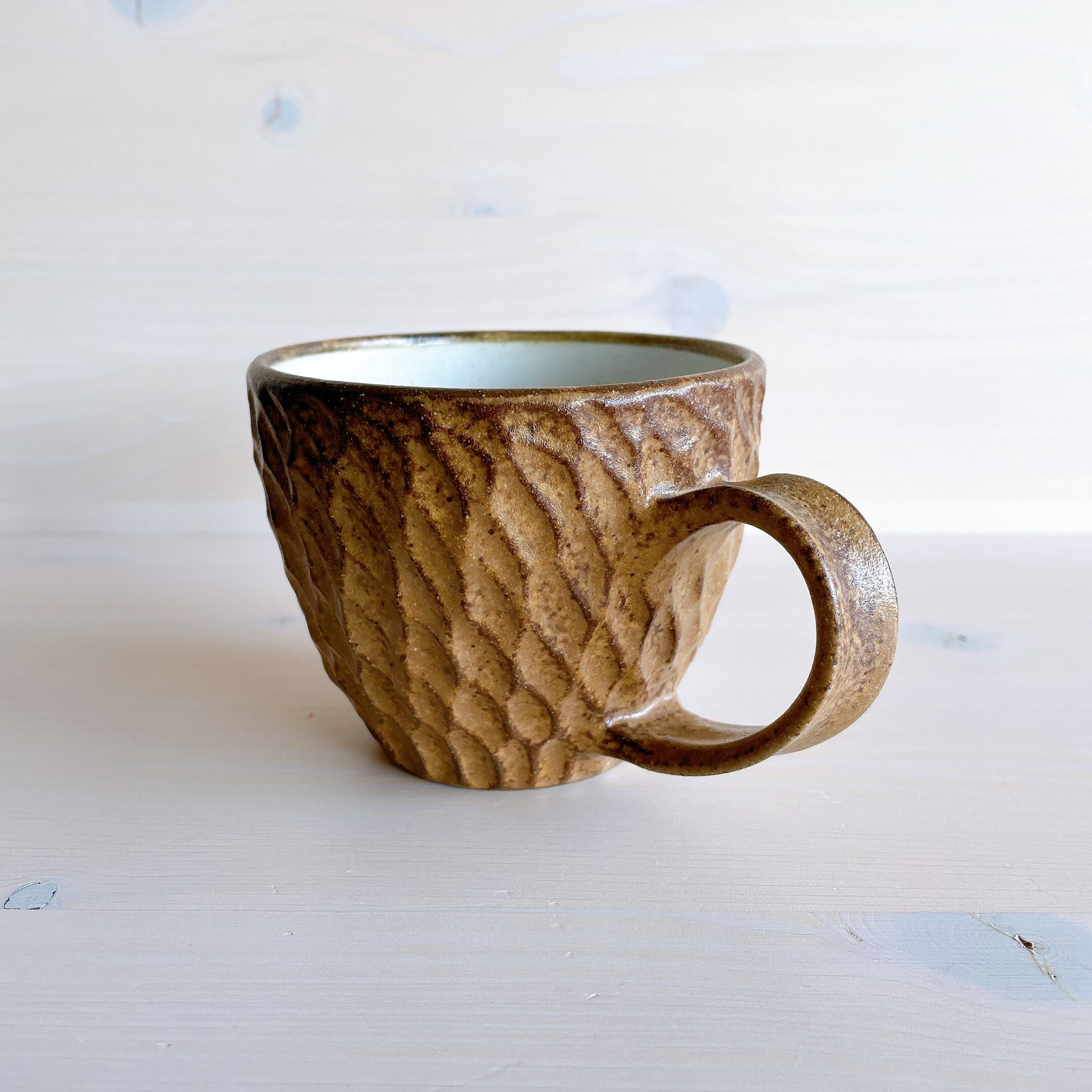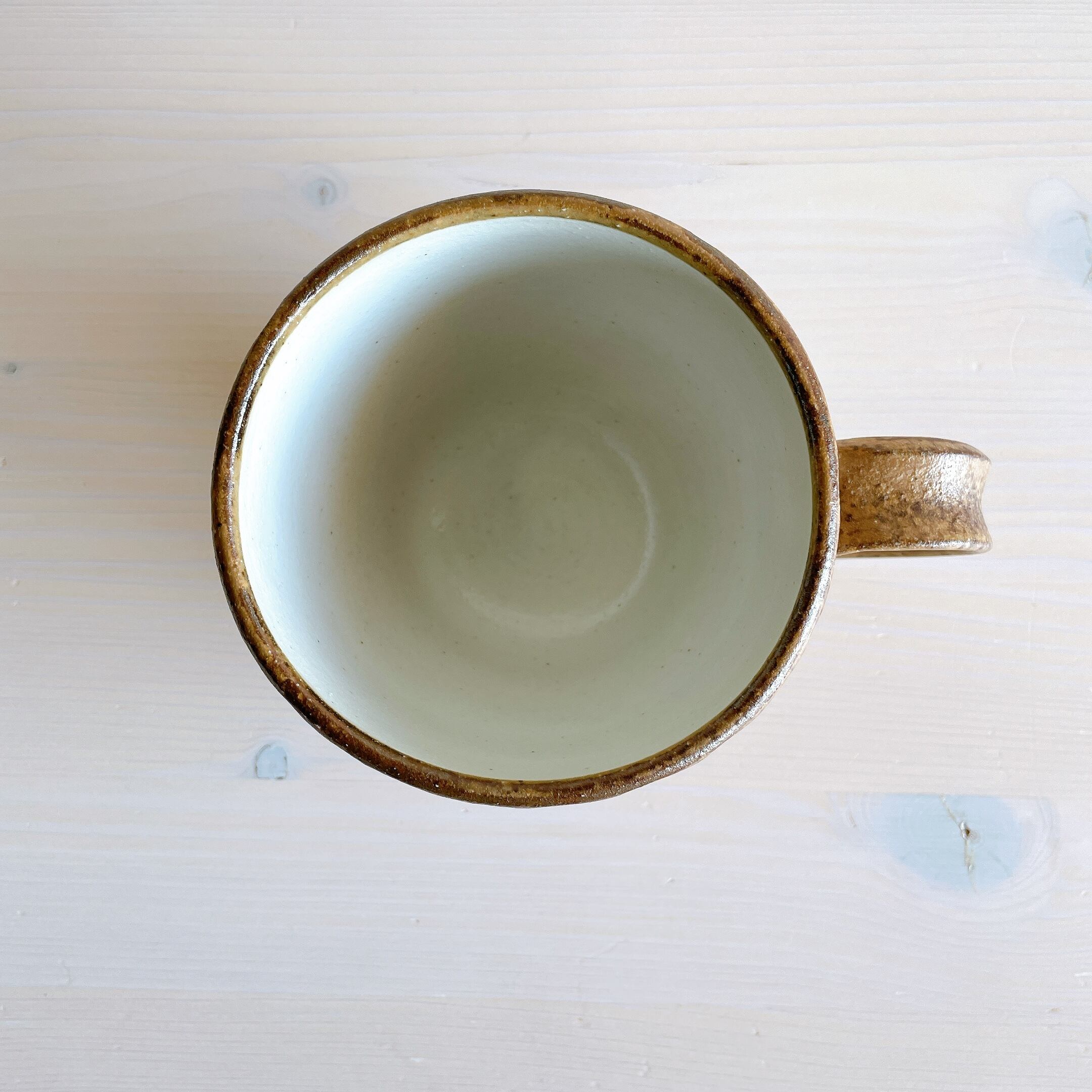 読谷村にある陶器工房「nagaremo」のマグカップです。南国のナッツをイメージしたというデザインにアンティークのようなどこかホッとする色合い。ポッテリとした丸みのある形が手によく馴染みます。