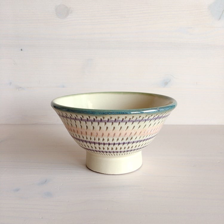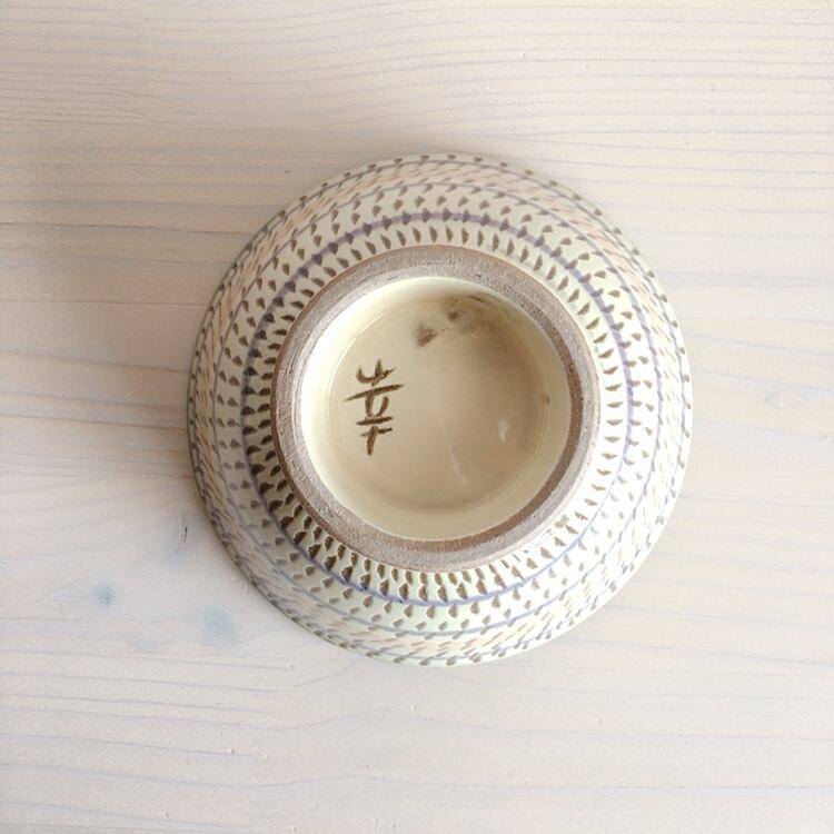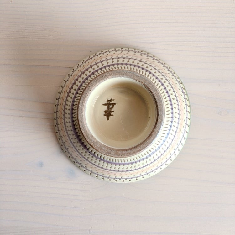 那覇市に工房を構える幸陶器の4寸皿です。飛び鉋(カンナ)とという点々の彫り模様を全面に施し、可愛らしい色合いでボーダー模様を描いています。4寸と一般的なお茶碗のサイズです。