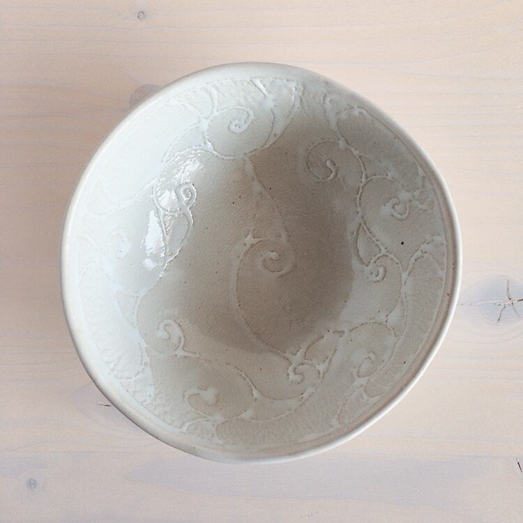眞正陶房のアラベスクシリーズのシリアルボウル。白地に重ねて白で描いているのは、眞正陶房オリジナルの唐草模様。柔らかな白がとても上品な雰囲気の器です。