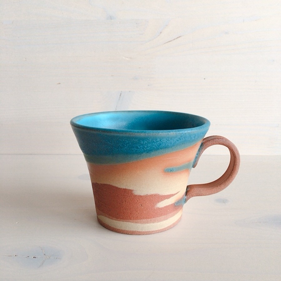2種類の土で生みマーブル出すマーブル模様が美しいカップは青、緑、黄色で3色ご用意しております。その他、水彩画のように優しい印象のフリーカップ、ターコイズの釉薬のグラデーションが美しいカップもございます。ぜひ合わせてご覧ください。
