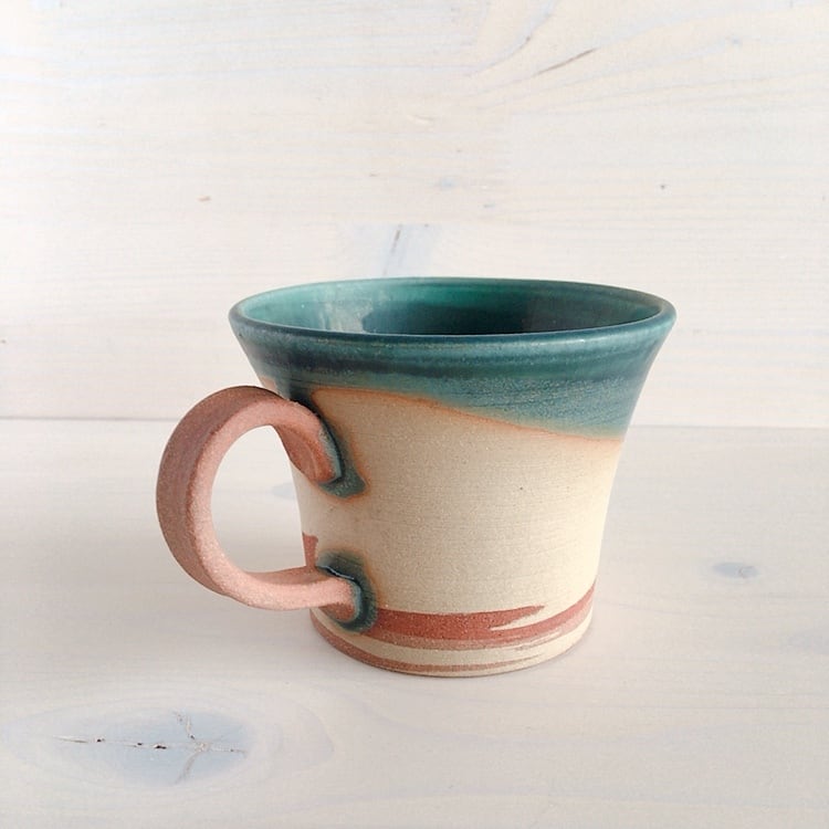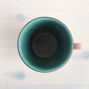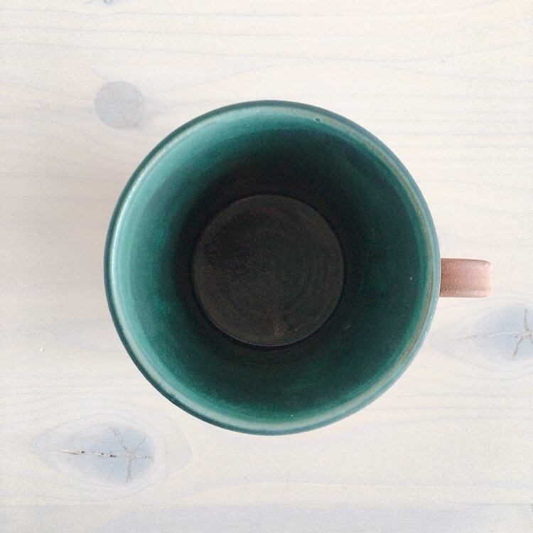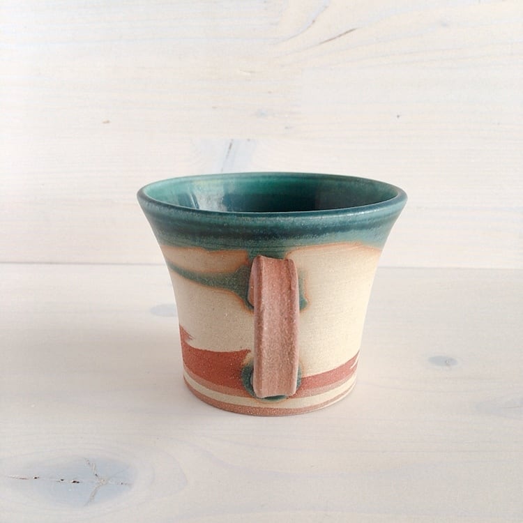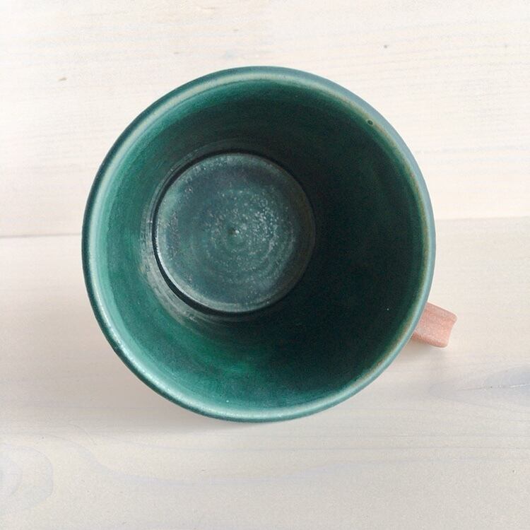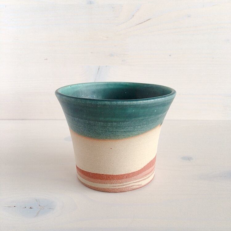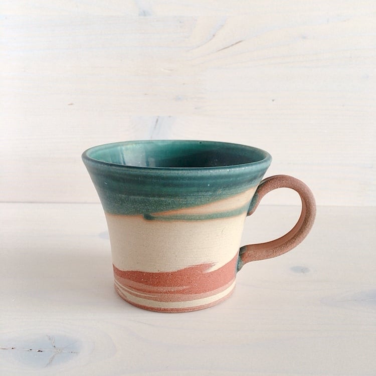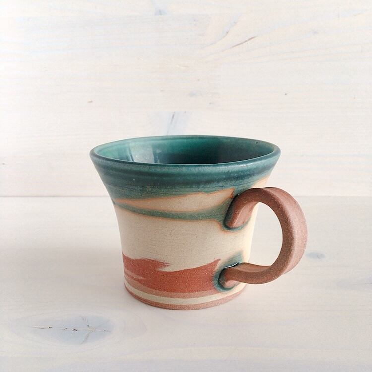 2種類の土を練り込むことで、偶然に生み出されるマーブル模様たち。釉薬の緑と土のコントラストが美しいカップで、手触りはマットです。