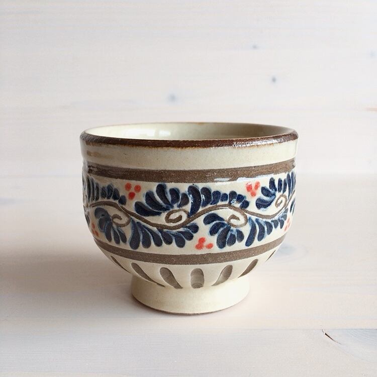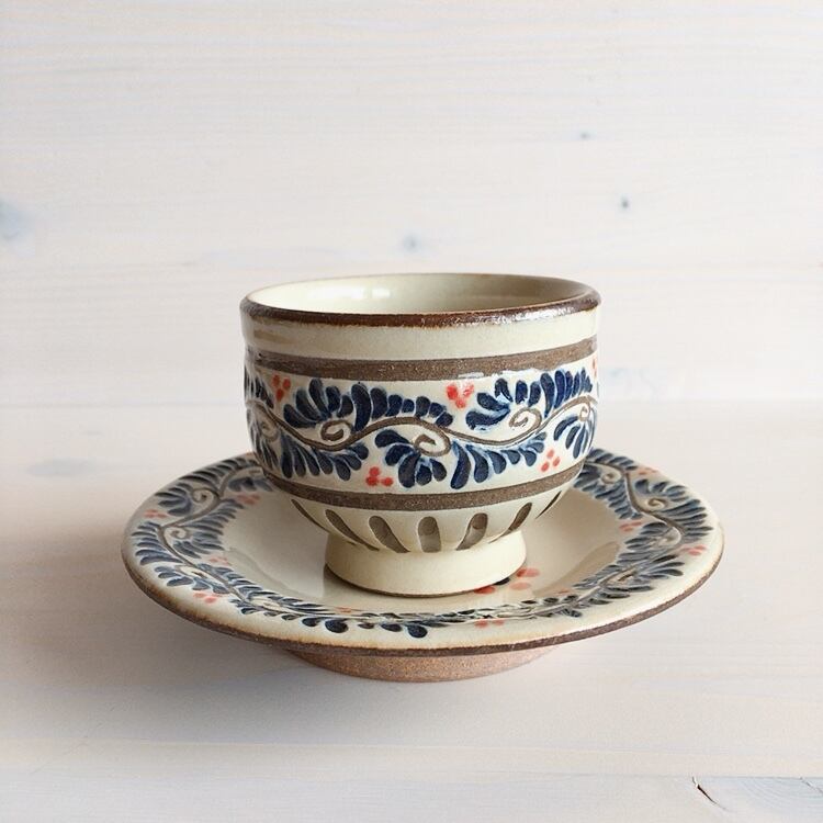 読谷村に工房を構える陶房高江洲の湯呑みと茶托のセット。唐草模様を細やかに彫った後から、色付けをしている手の込んだ作品です。伝統的なやちむんの造りながら、とても可愛らしい雰囲気をまとっています。茶托は4寸サイズなので、和菓子をよそって普段使いもできそうですね。