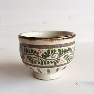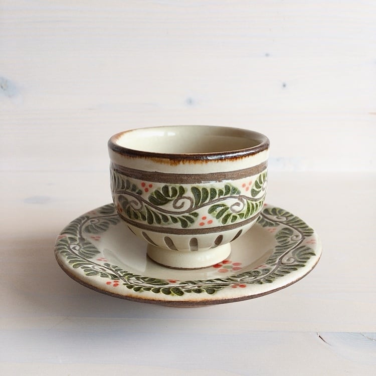 読谷村に工房を構える陶房高江洲の湯呑みと茶托のセット。唐草模様を細やかに彫った後から、色付けをしている手の込んだ作品です。伝統的なやちむんの造りながら、とても可愛らしい雰囲気をまとっています。茶托は4寸サイズなので、和菓子をよそって普段使いもできそうですね。