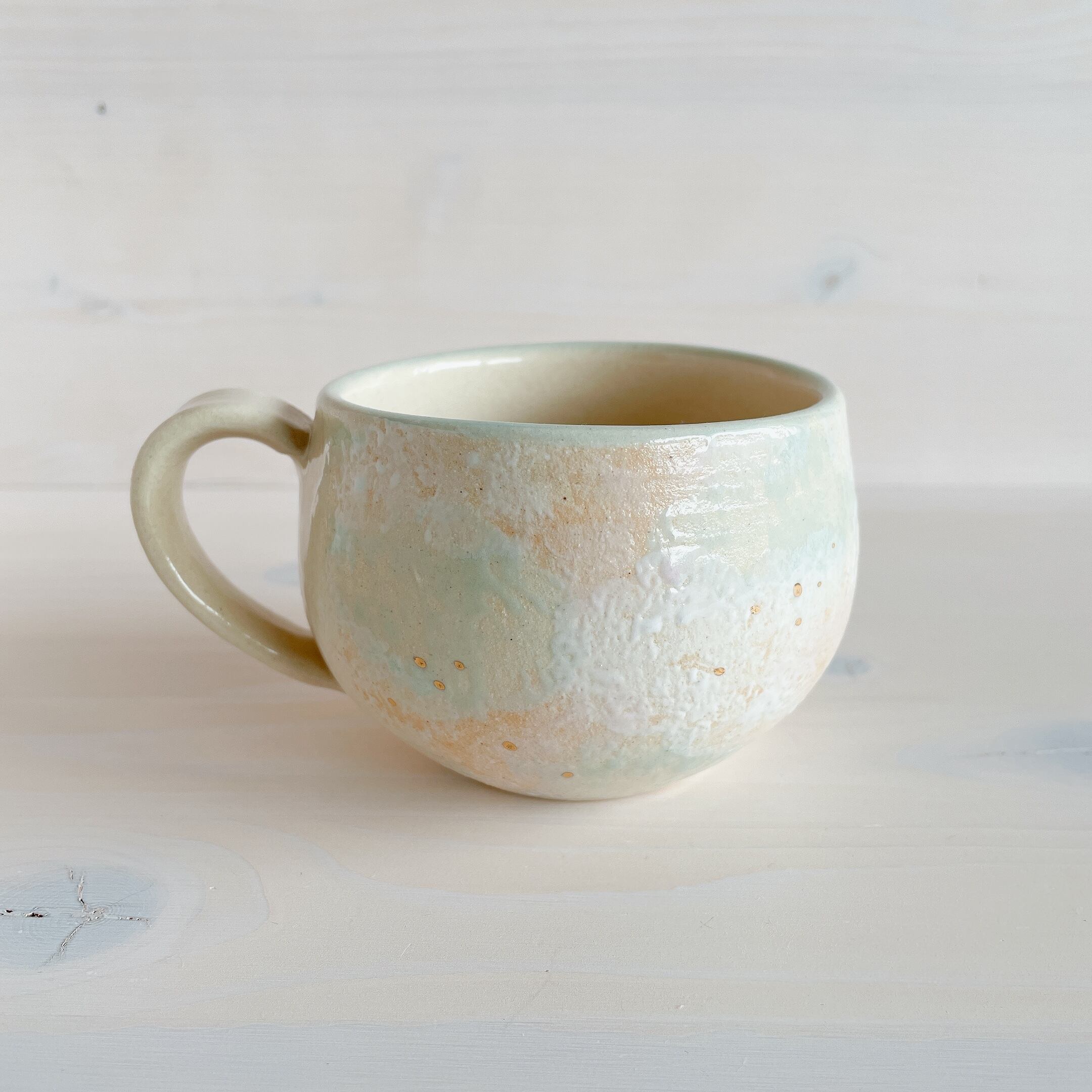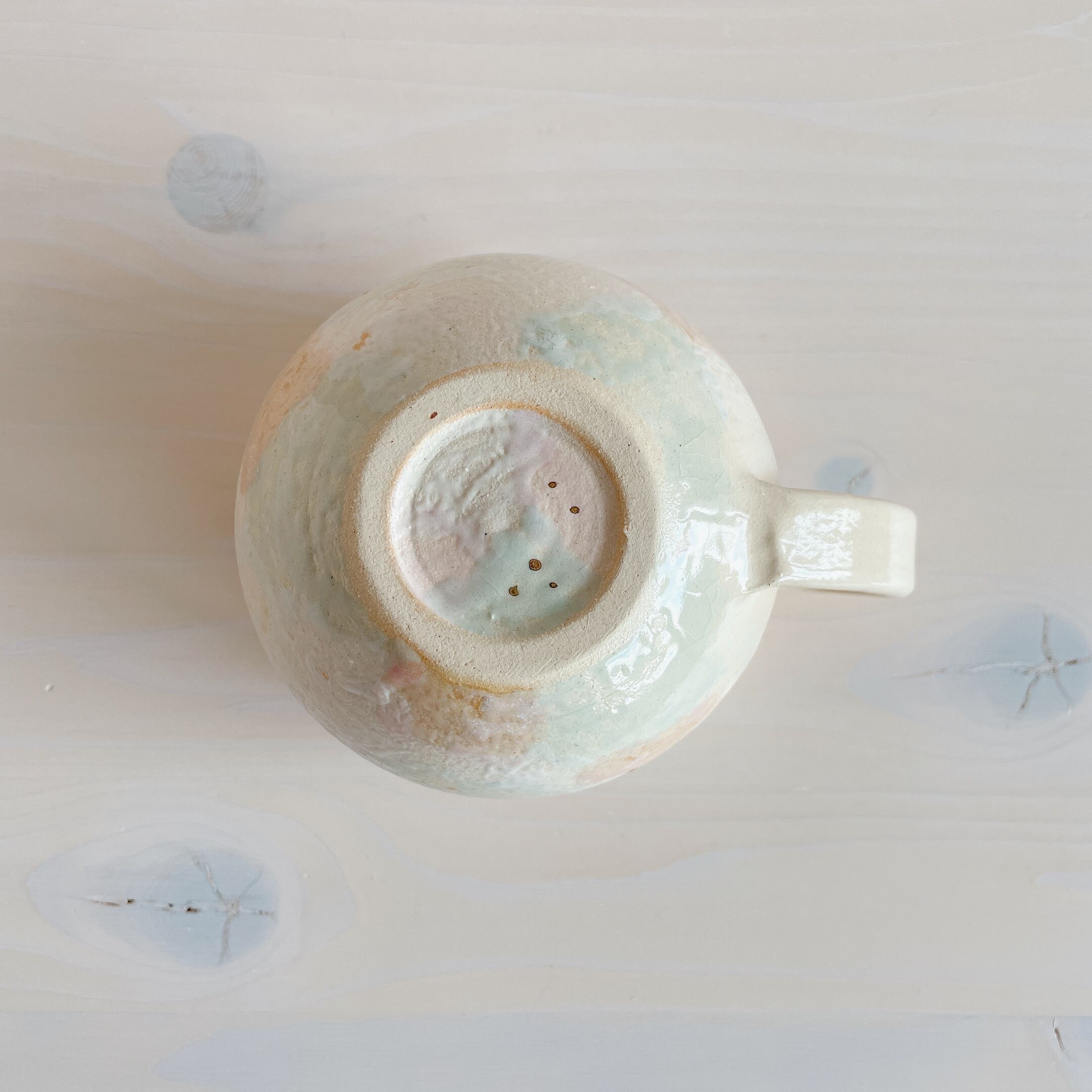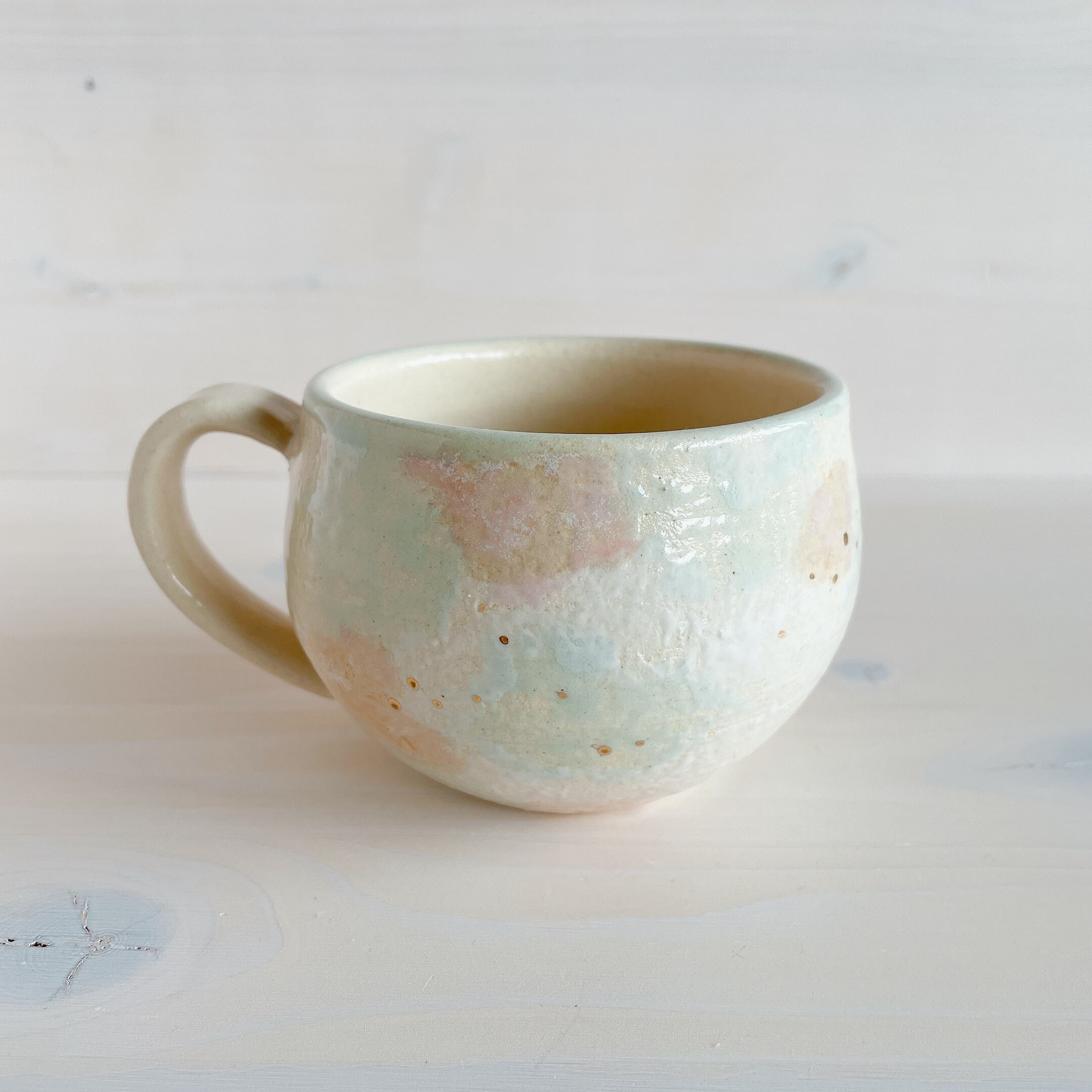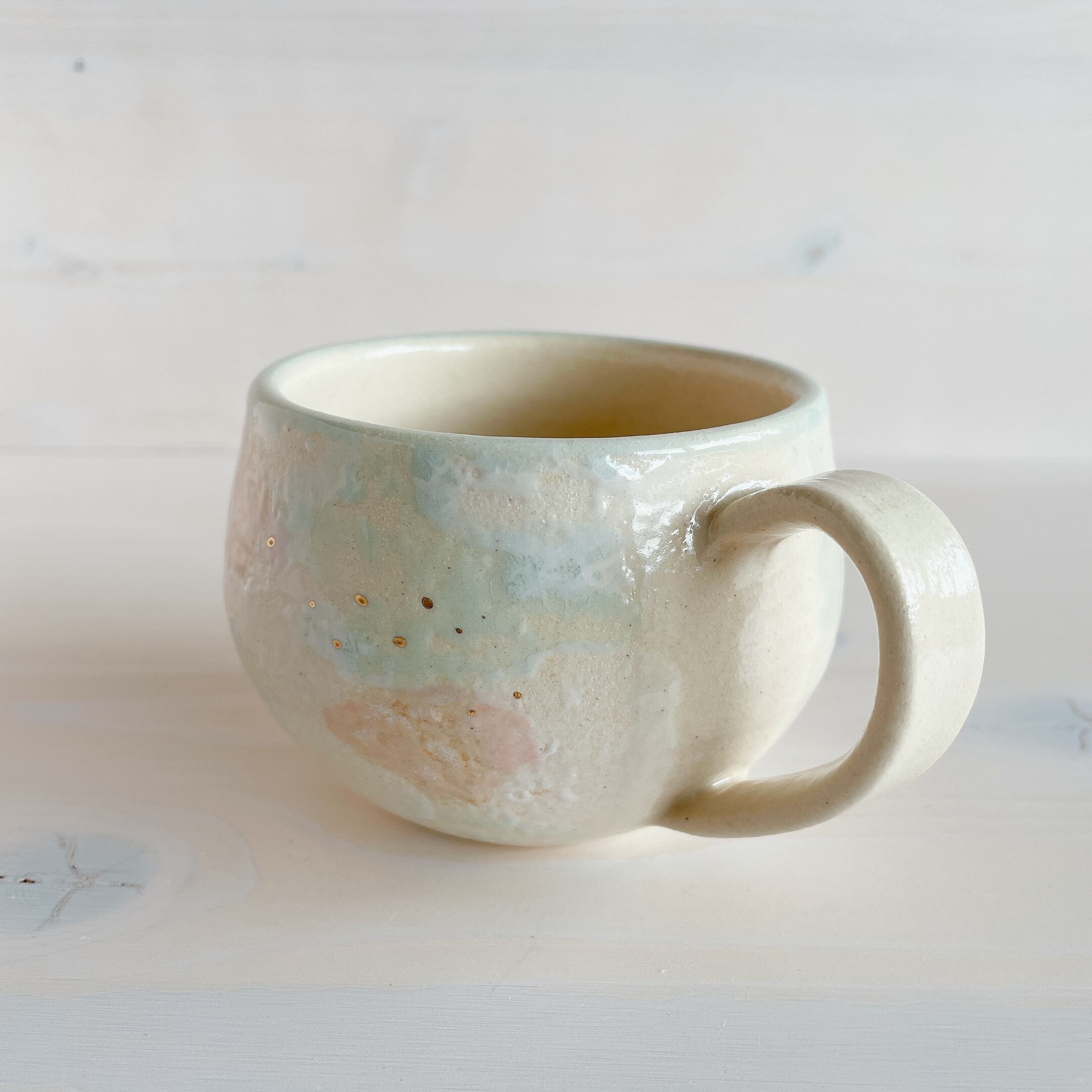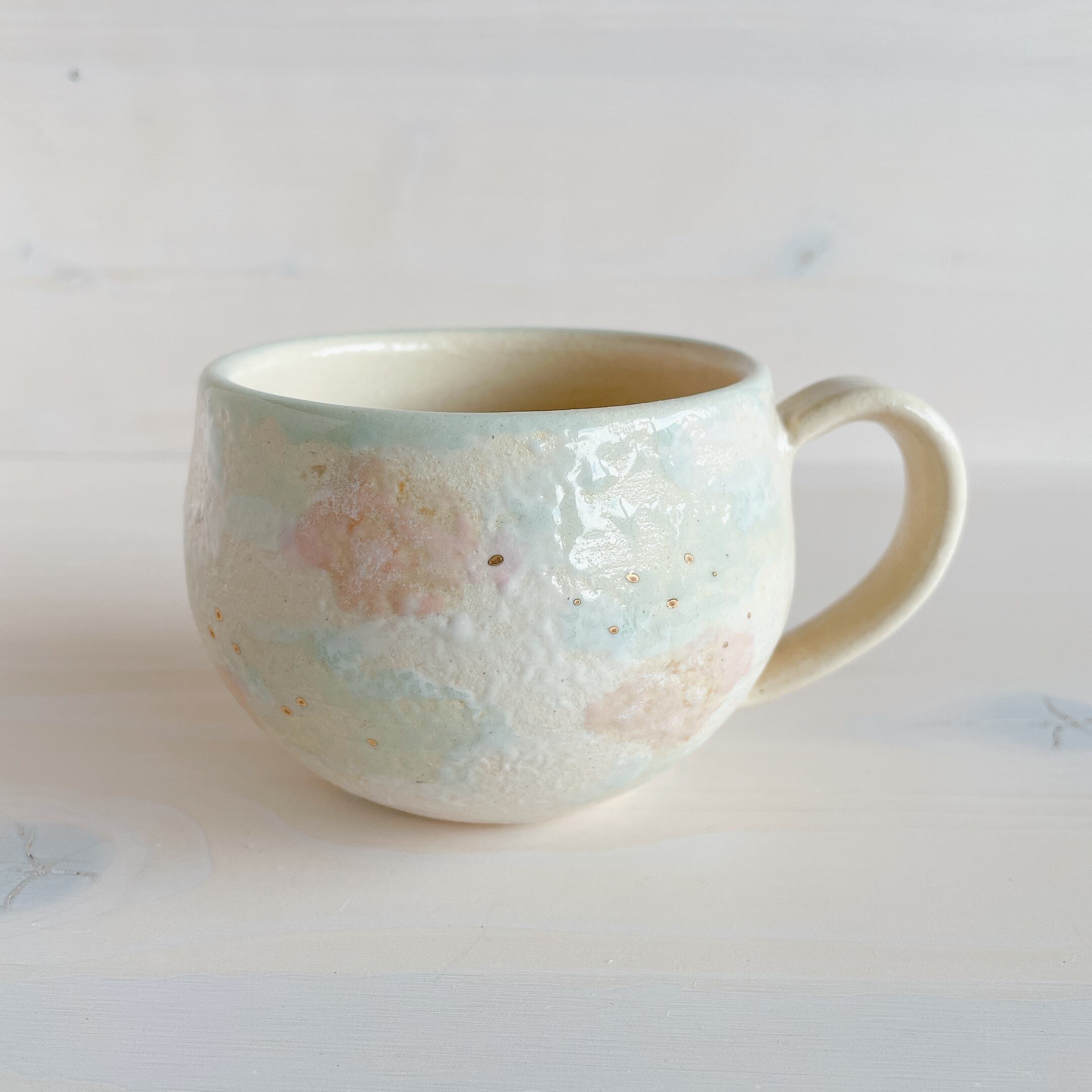 北中城村に工房を構える「sui」のまるんマグ。名前の通りまるっとした形が可愛らしく、柔らかなクリーム色をベースに、淡い水色、ピンクの釉薬で彩っています。ところどころに、小さくゴールドが入っていてアクセントに。