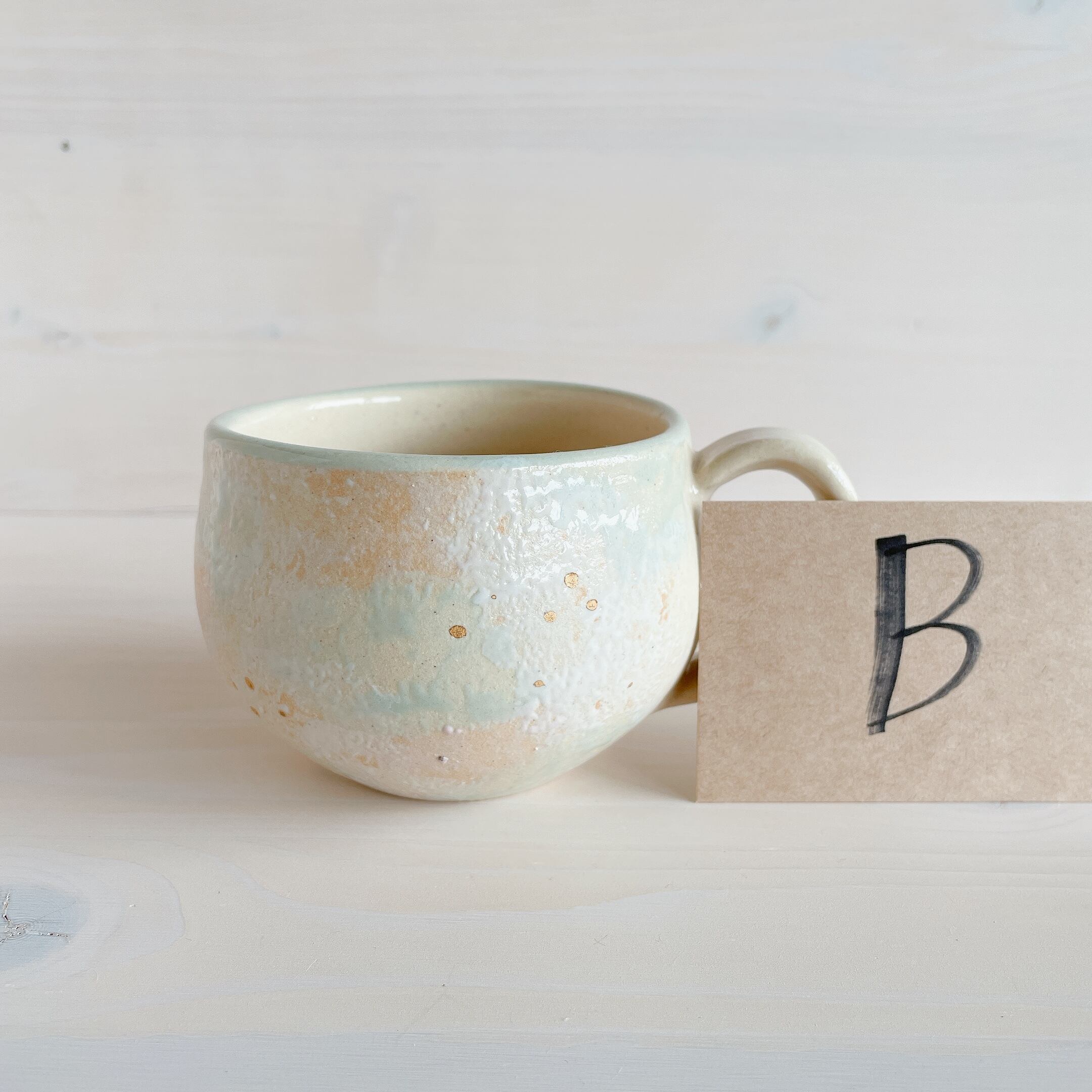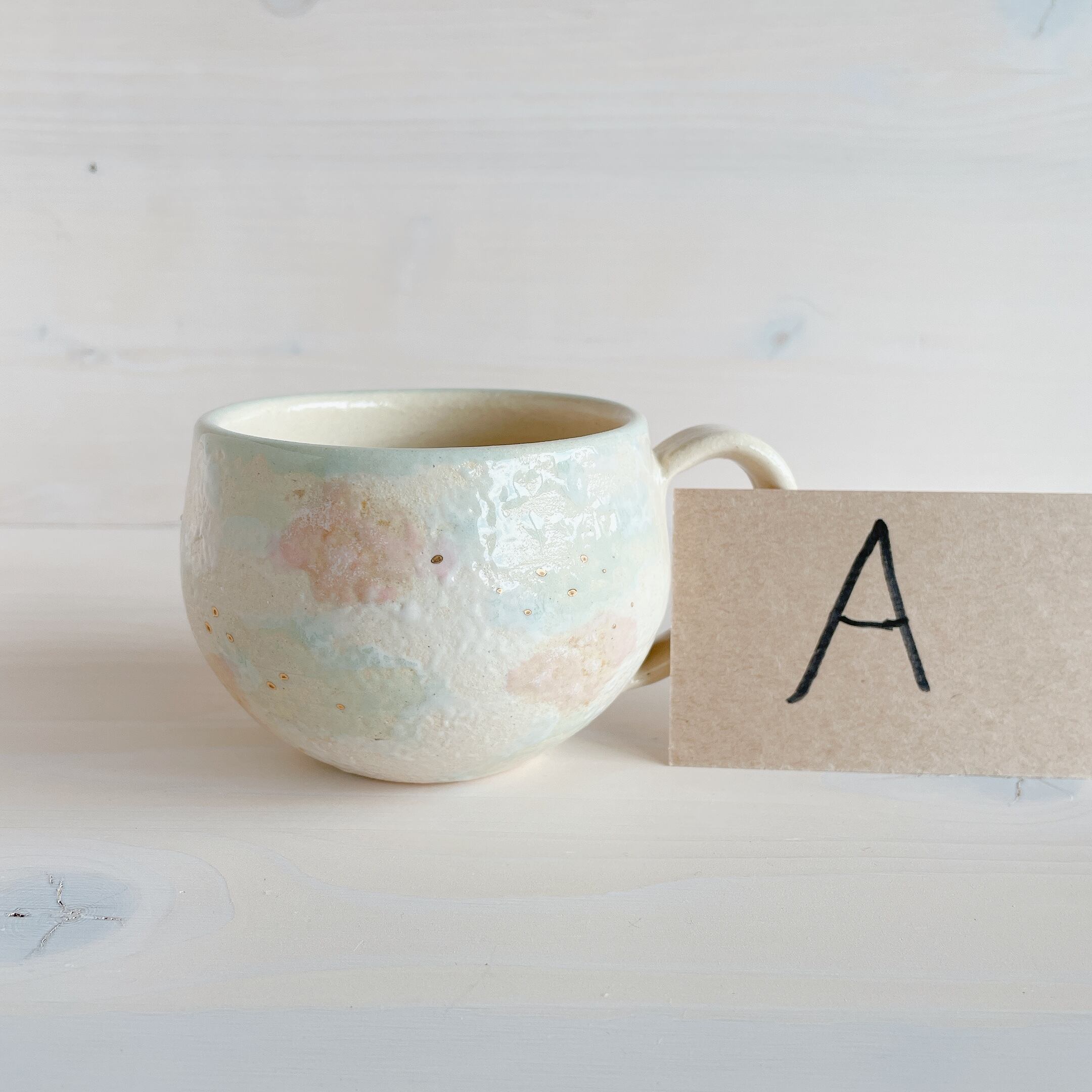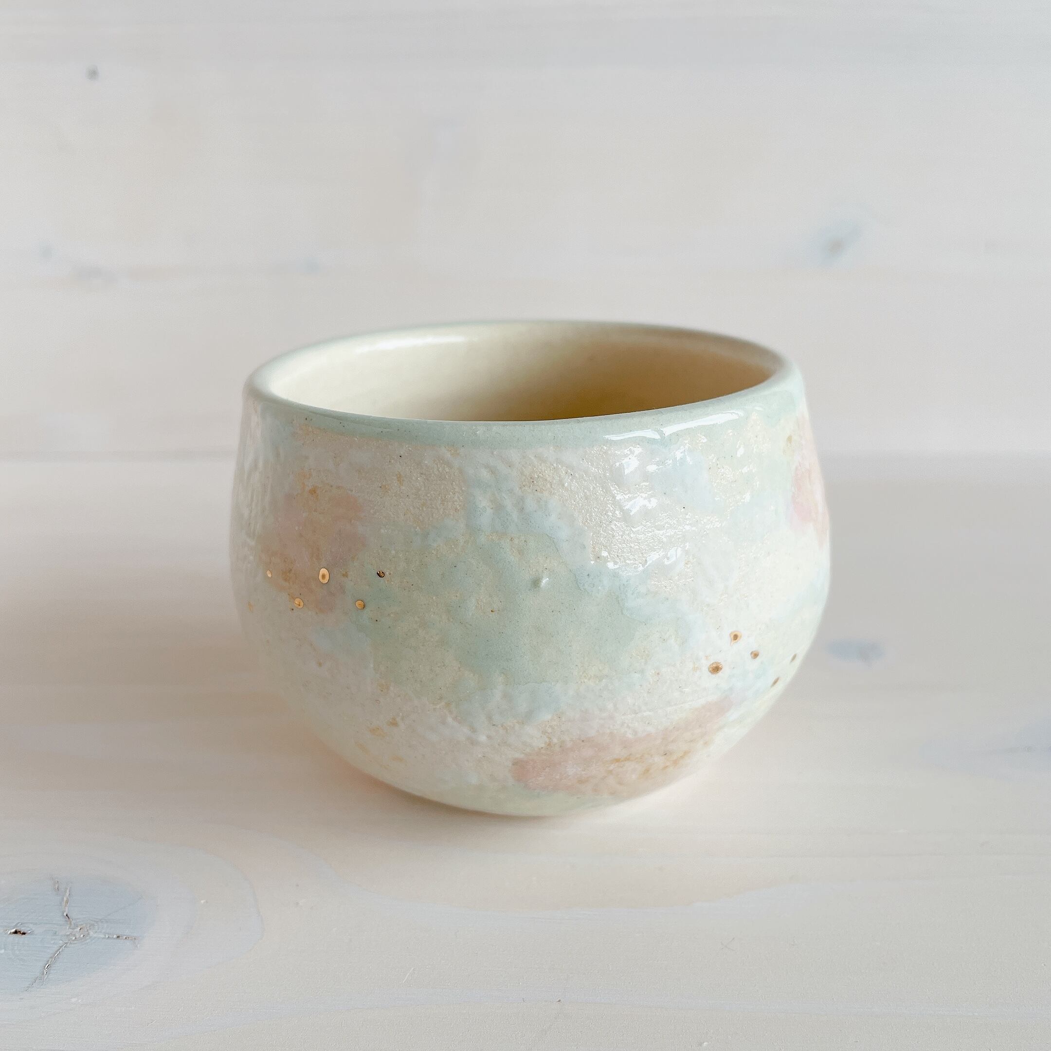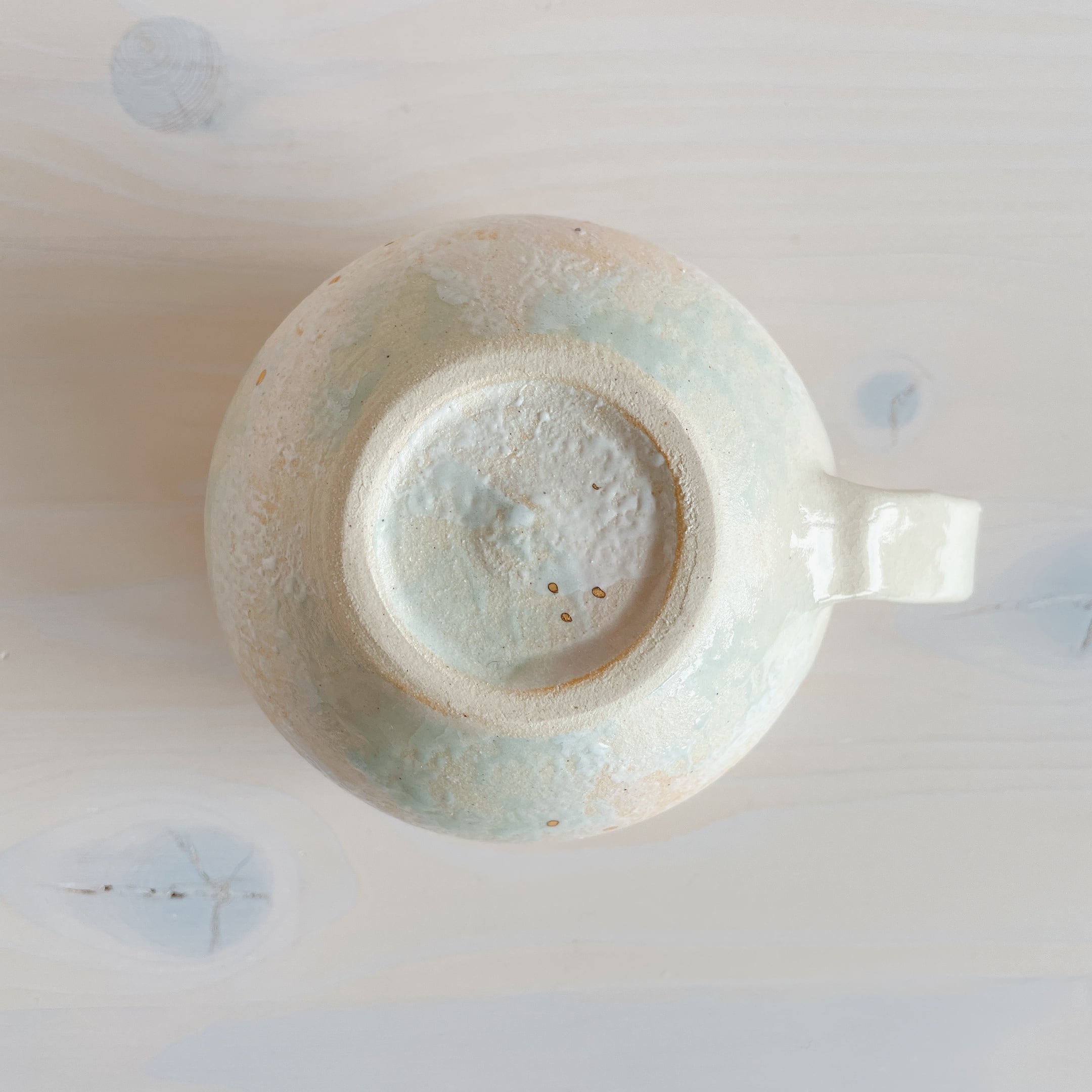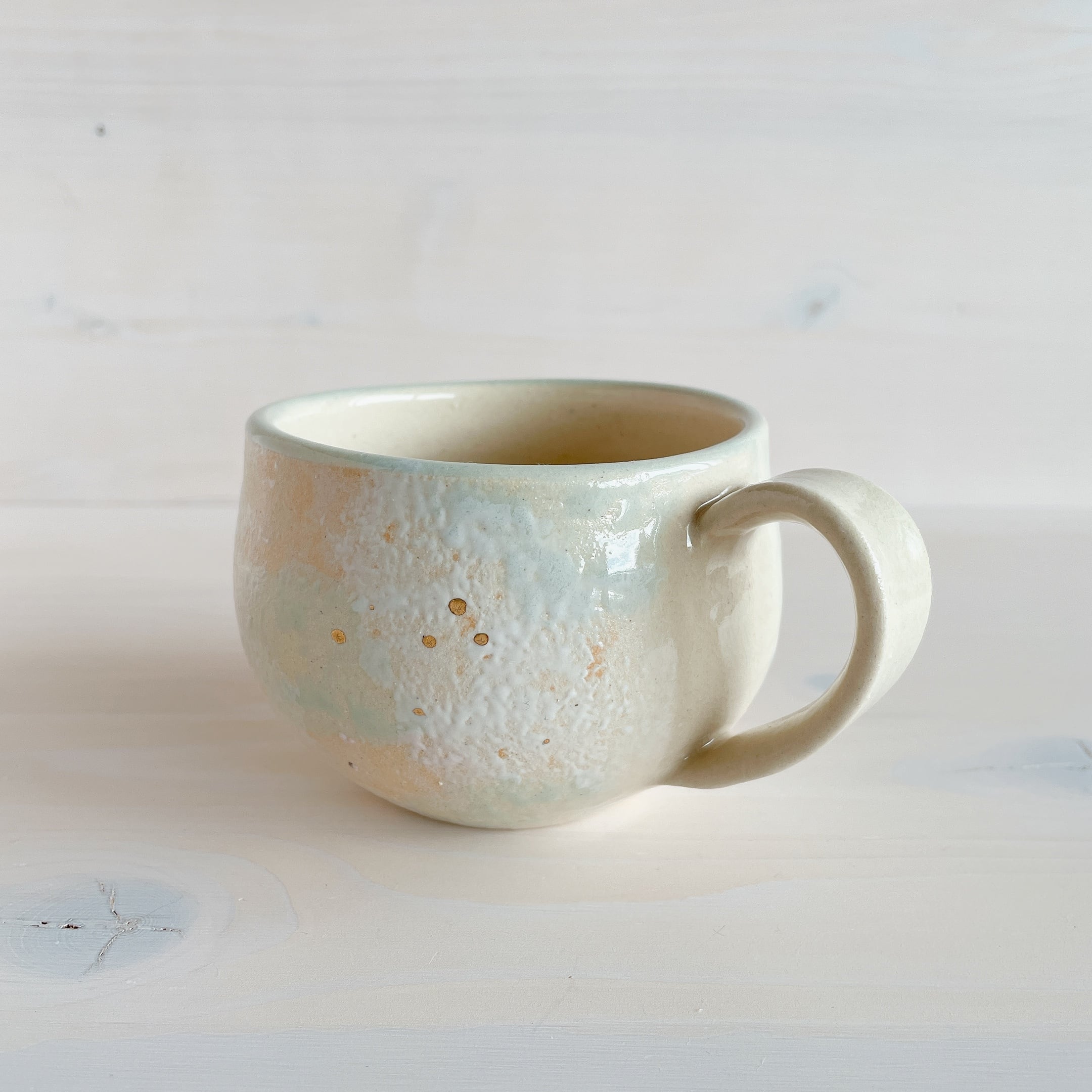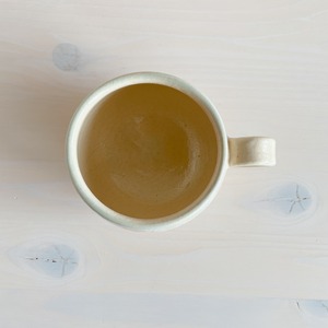北中城村に工房を構える「sui」のまるんマグ。名前の通りまるっとした形が可愛らしく、柔らかなクリーム色をベースに、淡い水色、ピンクの釉薬で彩っています。ところどころに、小さくゴールドが入っていてアクセントに。