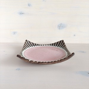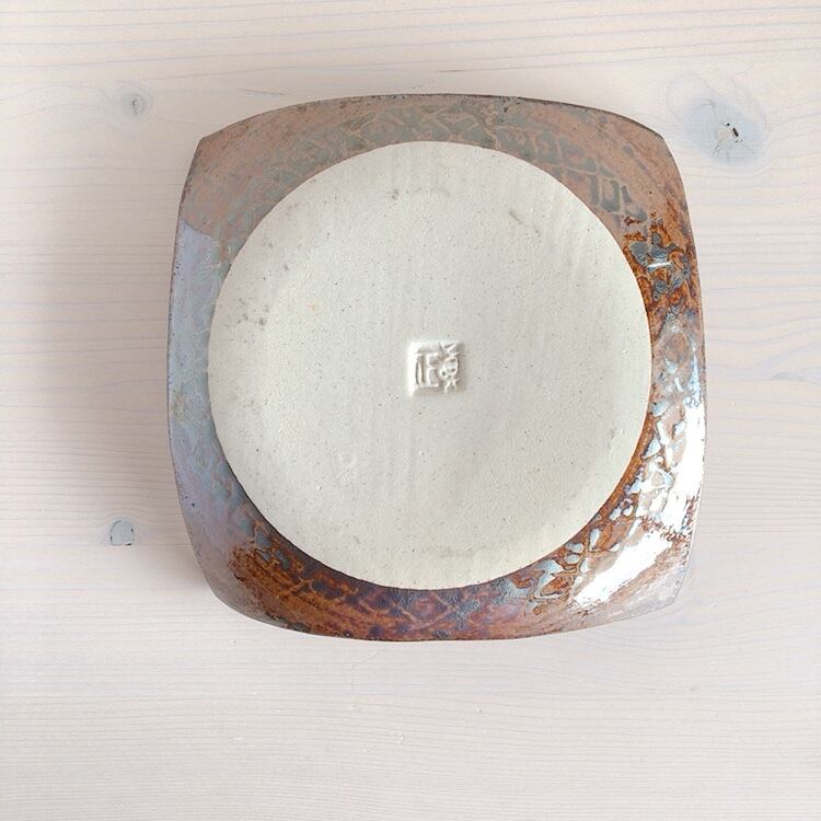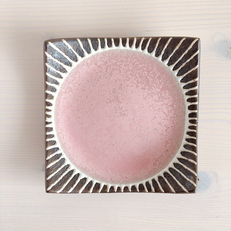 眞正陶房の角皿(約15cm四方)です。ピンクの釉薬の結晶が全面に出ていて、まるで桜の花びらのようです。マカロンシリーズは眞正陶房の安里貴美枝さんが、初めてお菓子のマカロンに出会った際に、色の持つパワーに感激した経験をもとに作られた作品。10種を超える色展開に加え、7寸浅鉢を中心に、シリアルボウル、小鉢、角皿、マグカップなどたくさんの種類があり、食卓を明るく彩ってくれます。好きな色を集めるファンの方も多いシリーズです。