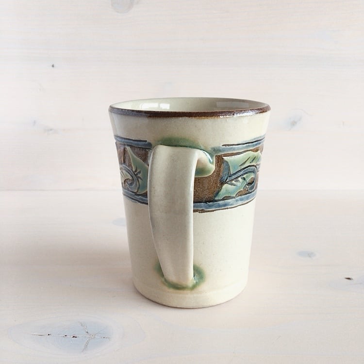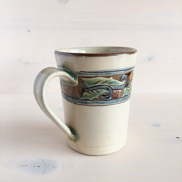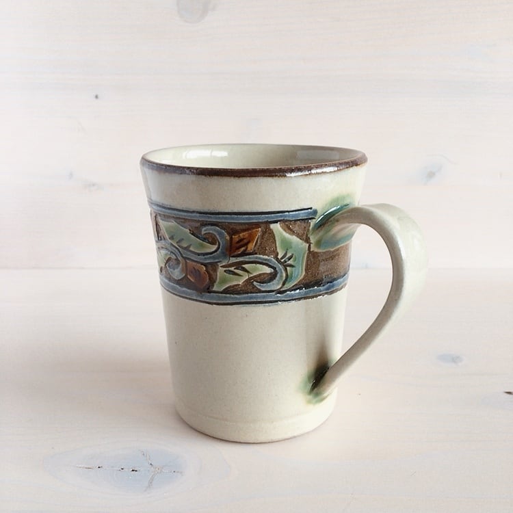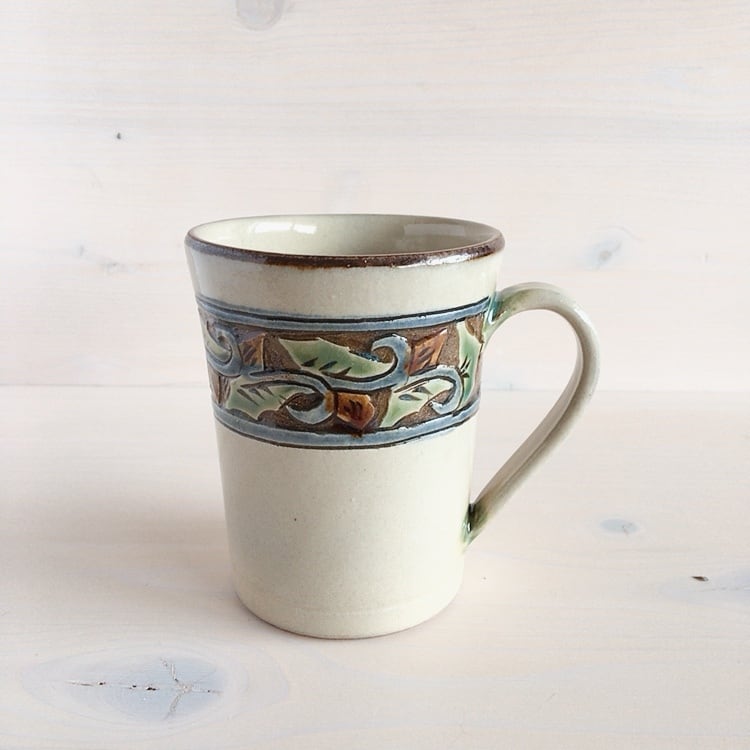 読谷村に工房を構える陶房高江洲のマグカップ。唐草模様の縁を彫刻のように削ることで浮き立たせ、緑釉、飴釉、呉須を使用して華やかに仕上げていきます。やちむんらしい、柔らかな色使いで、陶房高江洲の代表的なシリーズのひとつです。