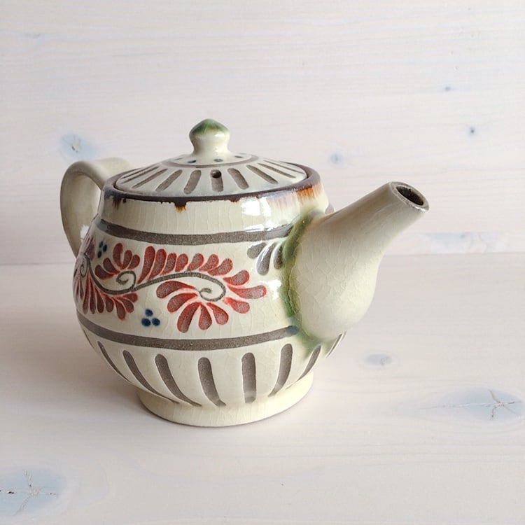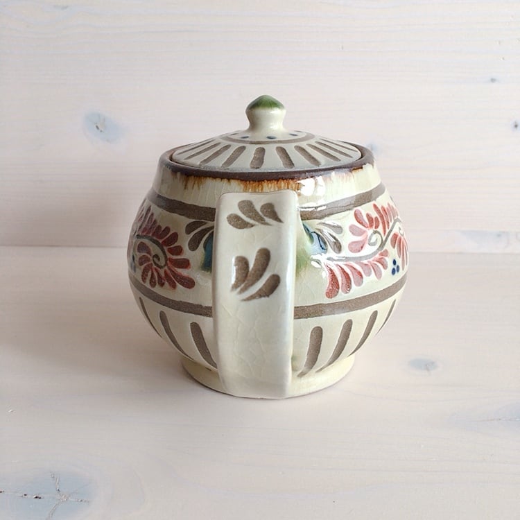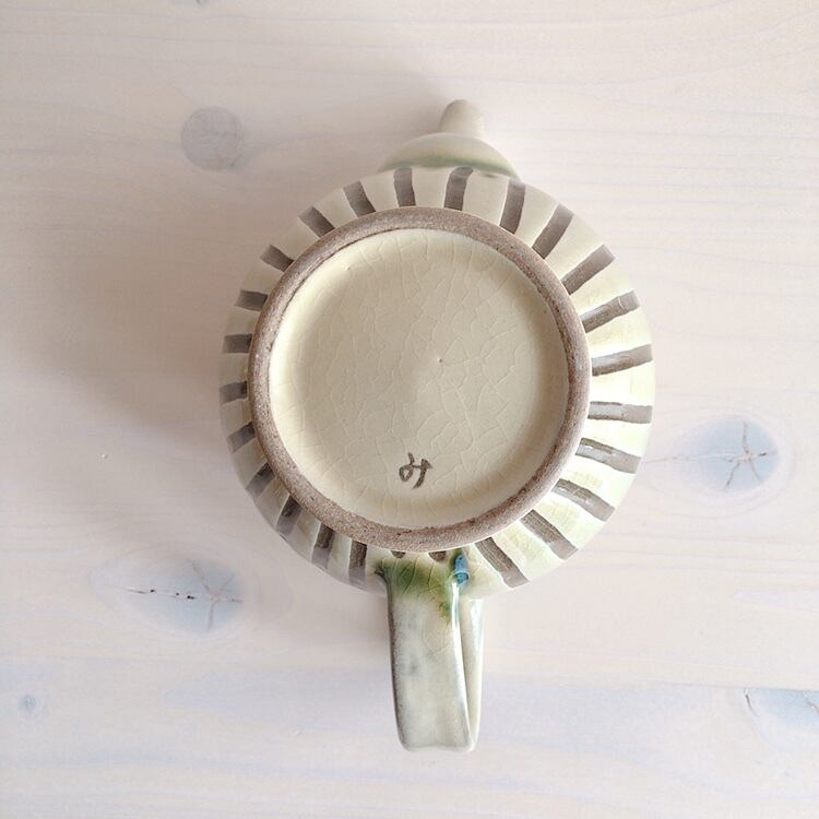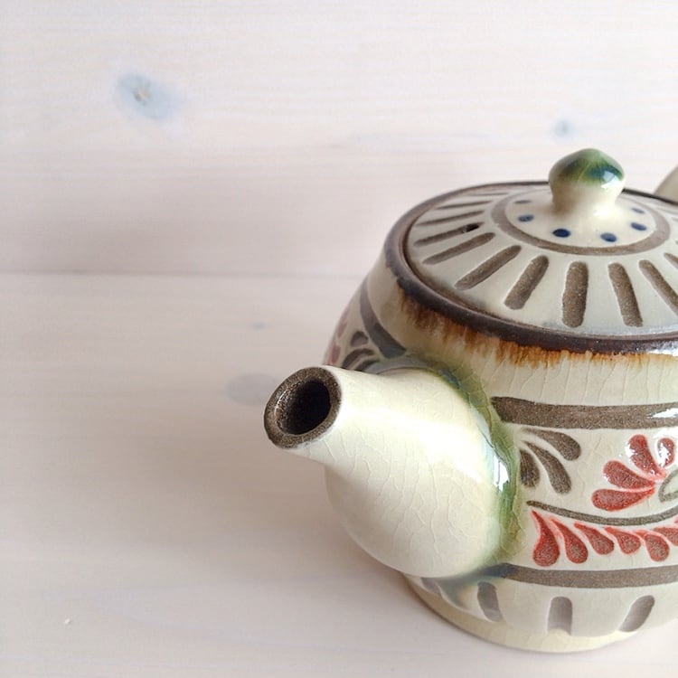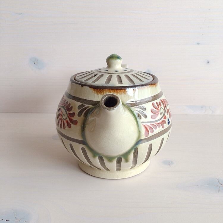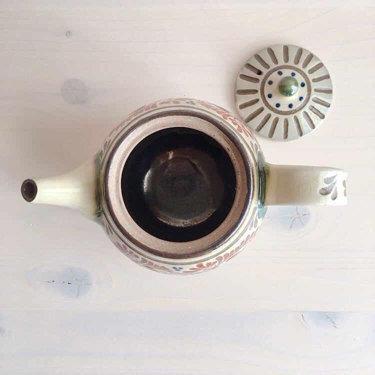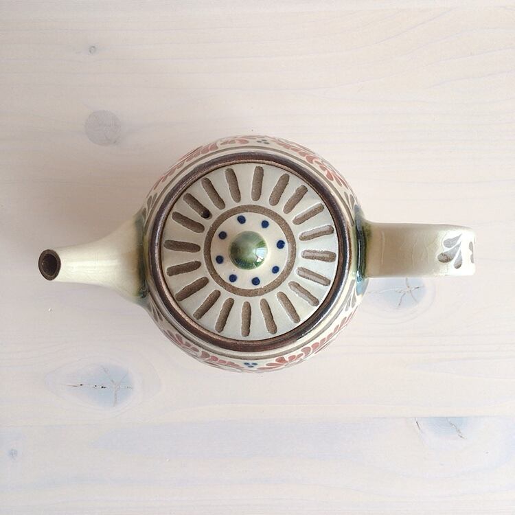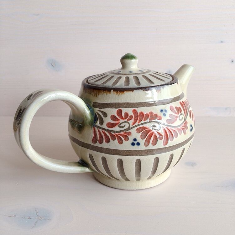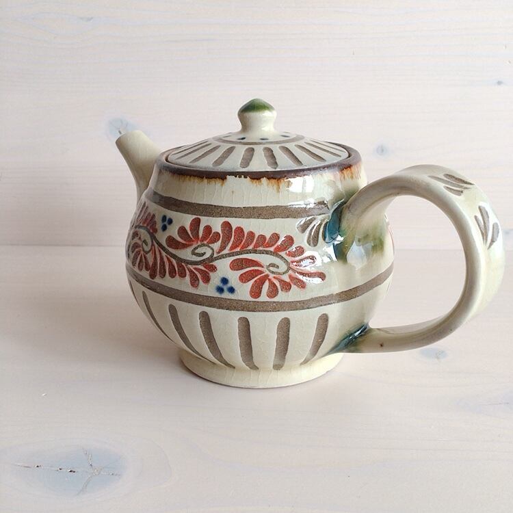 読谷村に工房を構える陶房高江洲のポット。唐草模様を細やかに彫った後から、色付けをしている手の込んだ作品です。伝統的なやちむんの造りながら、とても可愛らしい雰囲気をまとっています。
