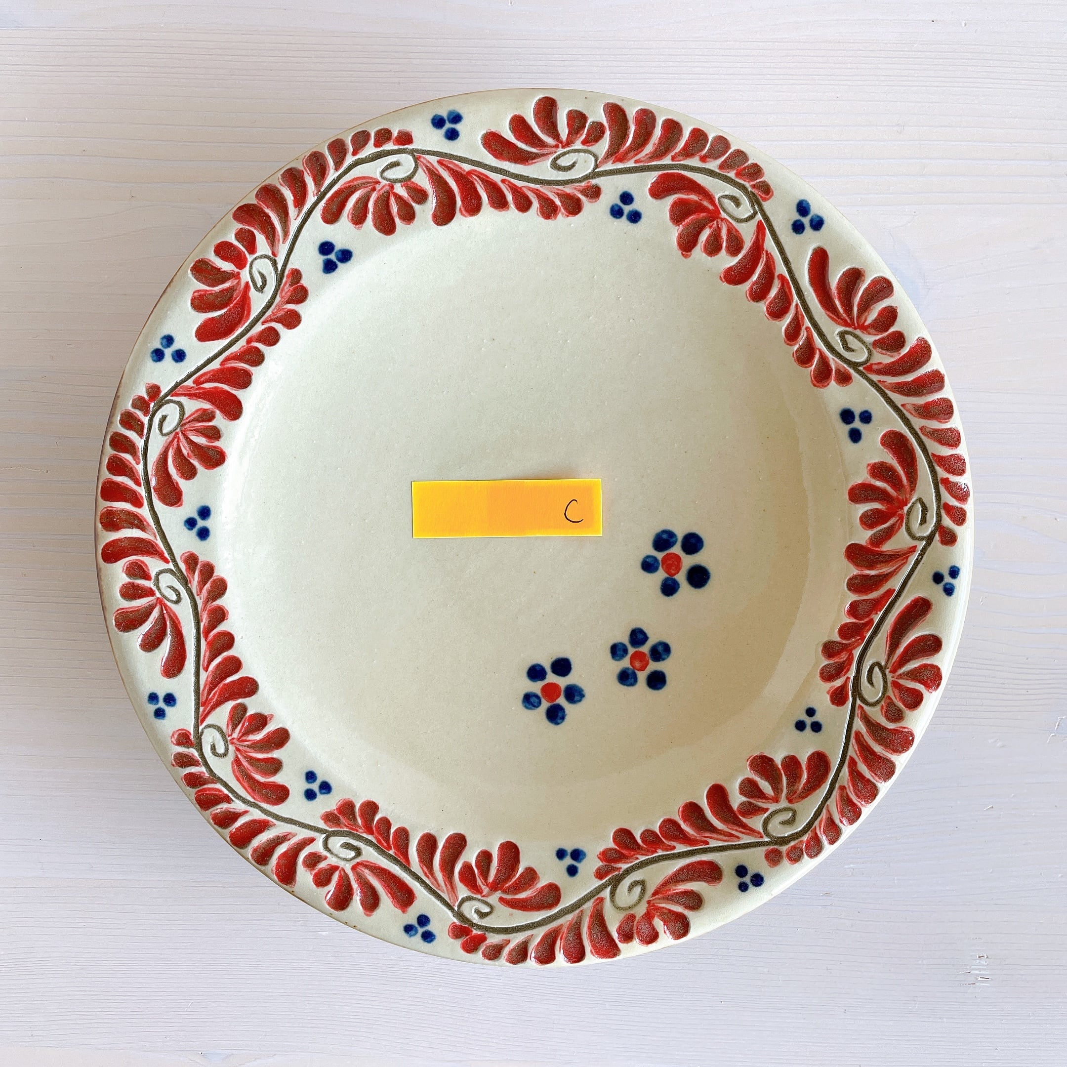 読谷村に工房を構える陶房高江洲の7寸リム皿。唐草模様を細やかに彫った後から、色付けをしている手の込んだ作品です。伝統的なやちむんの造りながら、とても可愛らしい雰囲気をまとっています。付箋にABCと記載がありますので、お好みのお皿をご指定ください。