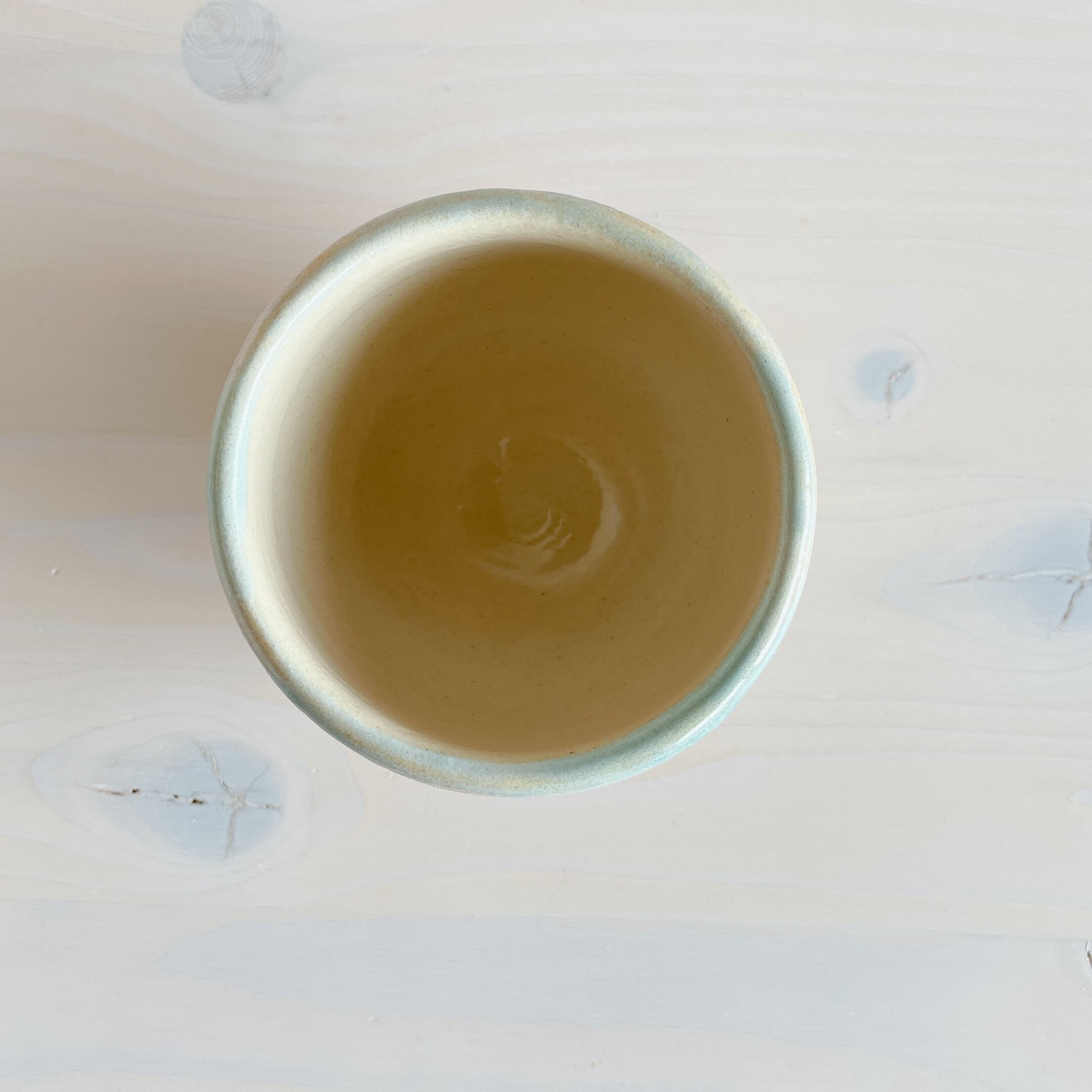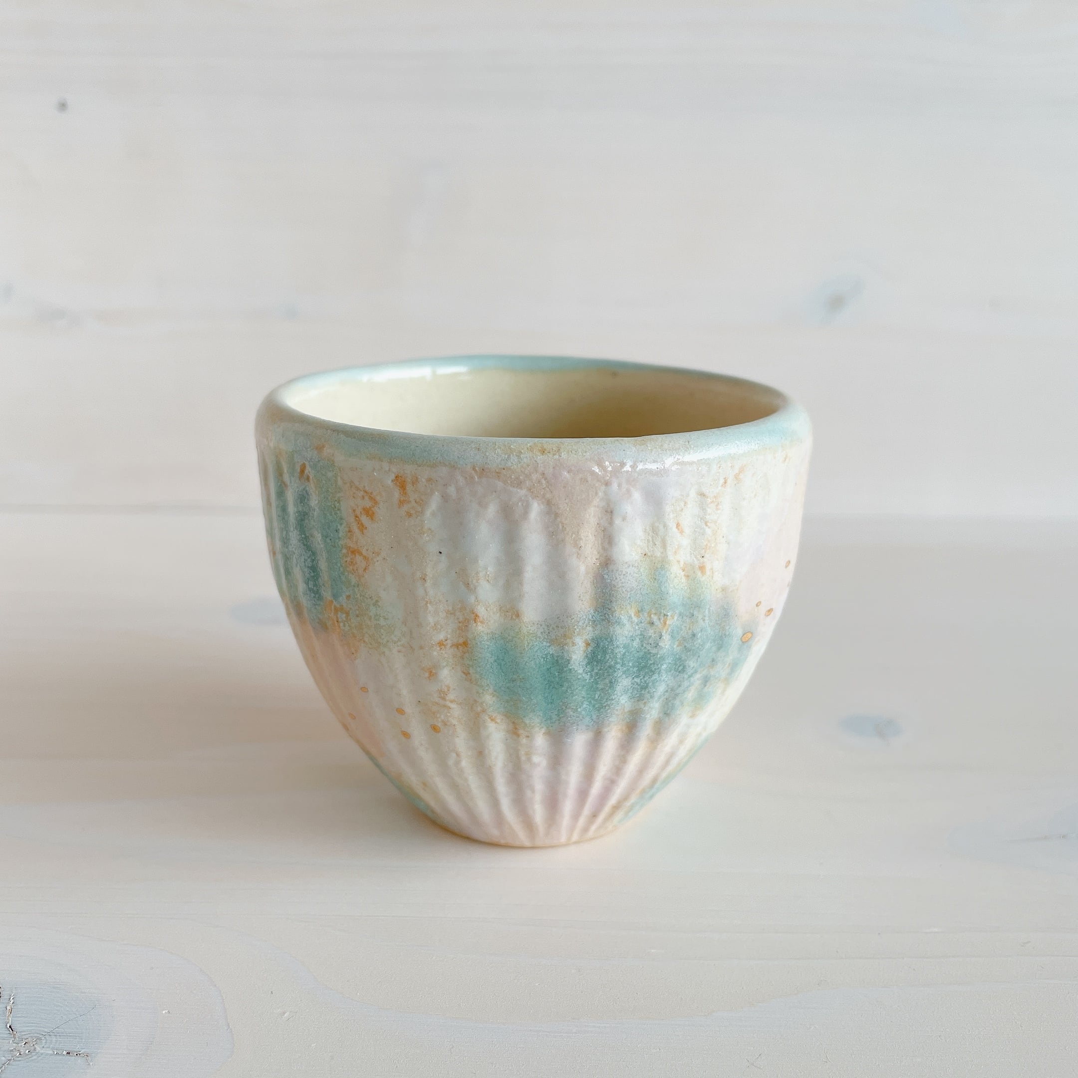 北中城村に工房を構える「sui」のフリーカップ。どんぐりのようにコロンとした形が可愛らしく、もちろん湯呑みとしてもお使い頂けます。柔らかなクリーム色をベースに、翡翠、白、ピンクの釉薬で彩っています。ところどころに、小さくゴールドが入っていてアクセントに。