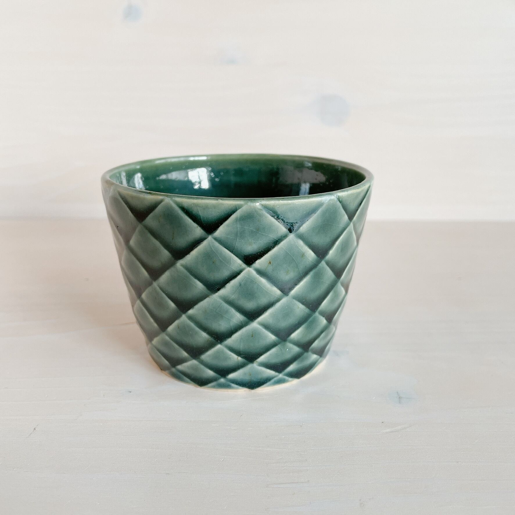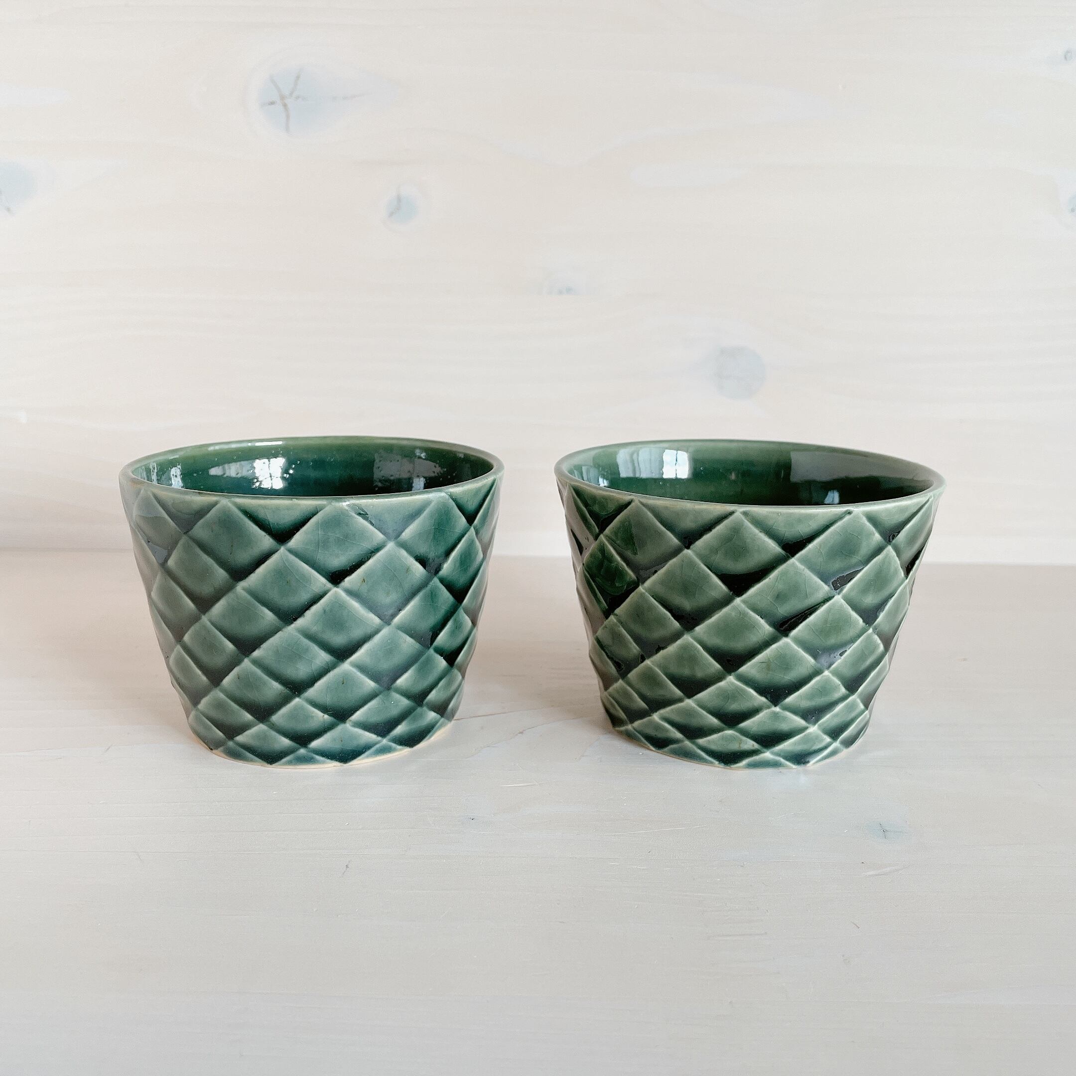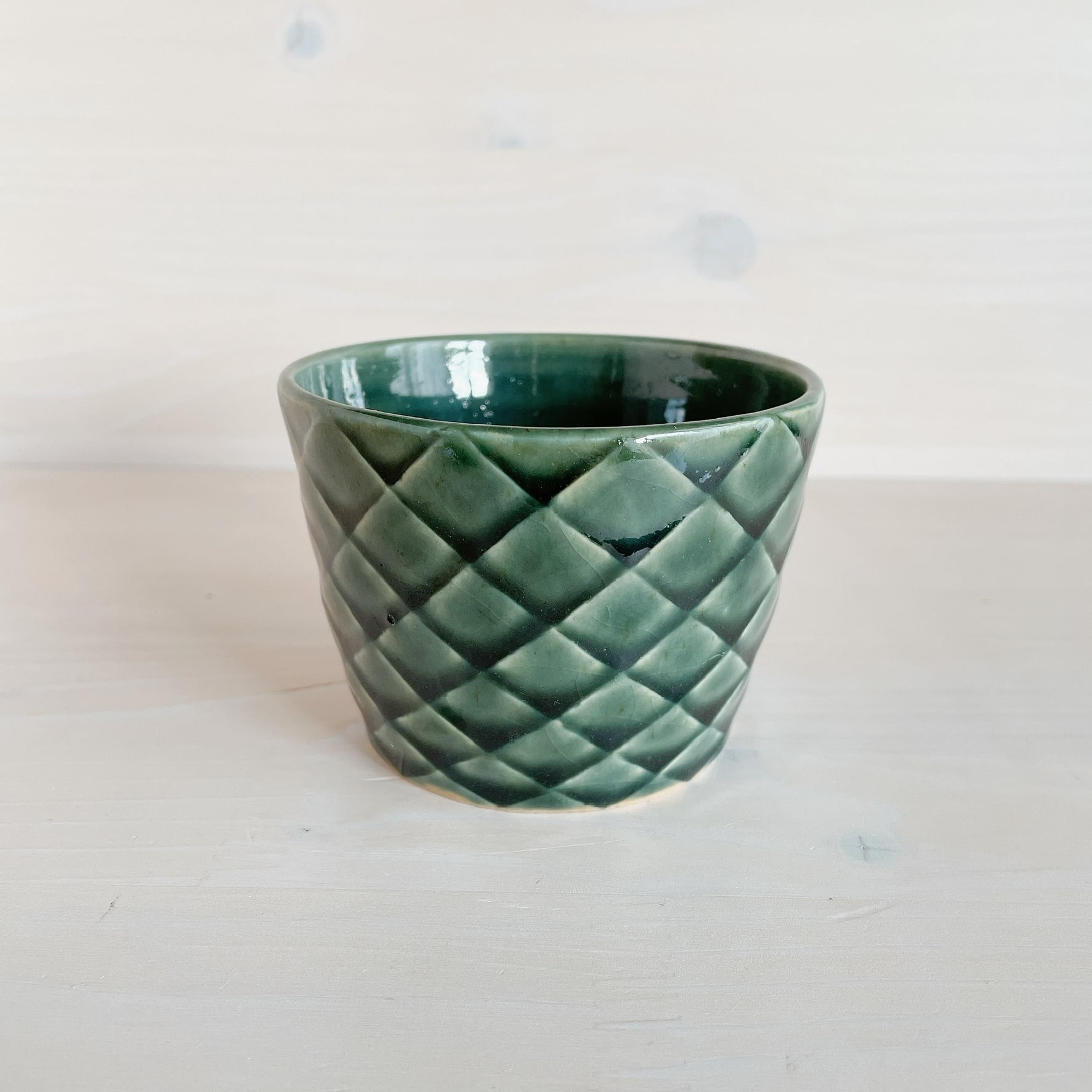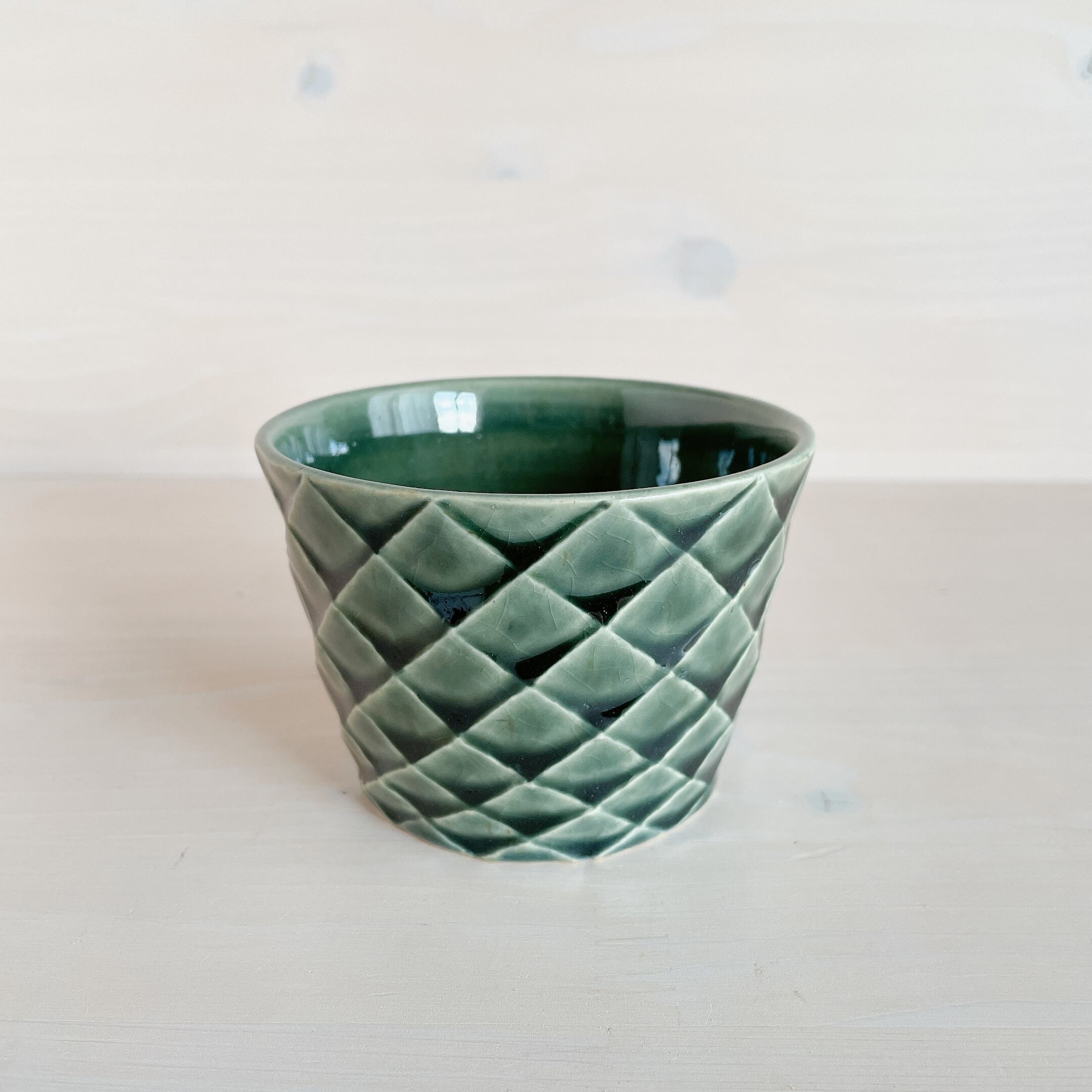 ダークグリーンのダイヤ柄は、大人っぽくどこか都会的ながら、温かい陶器ならではの雰囲気に包まれています。丁寧な手作業によって表面に凹凸を作り、釉薬によってパターンを浮き上がらせる技法を得意とされる、cercaならではの佇まい。手に持つとすっと馴染み、使いやすさも兼ね備えています。