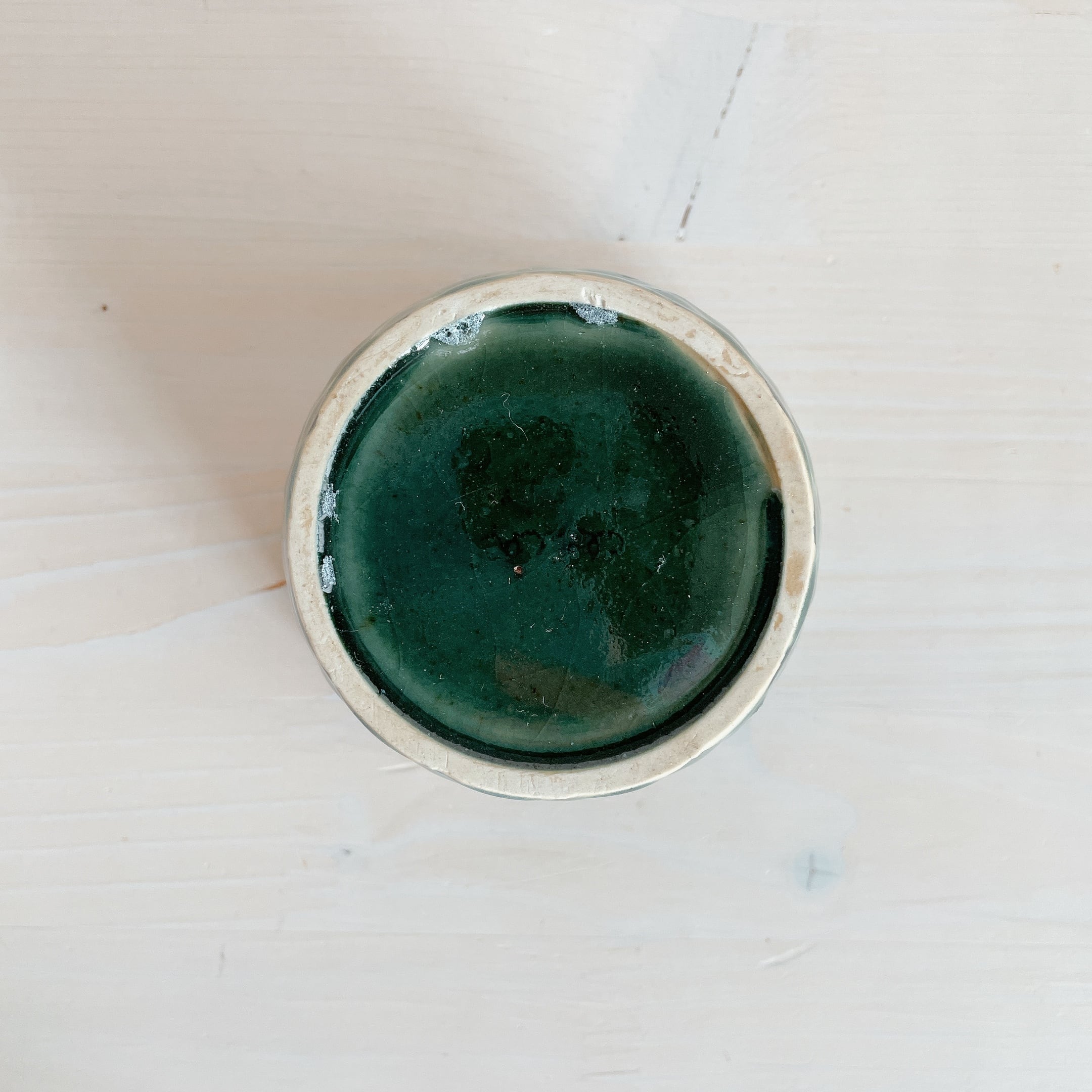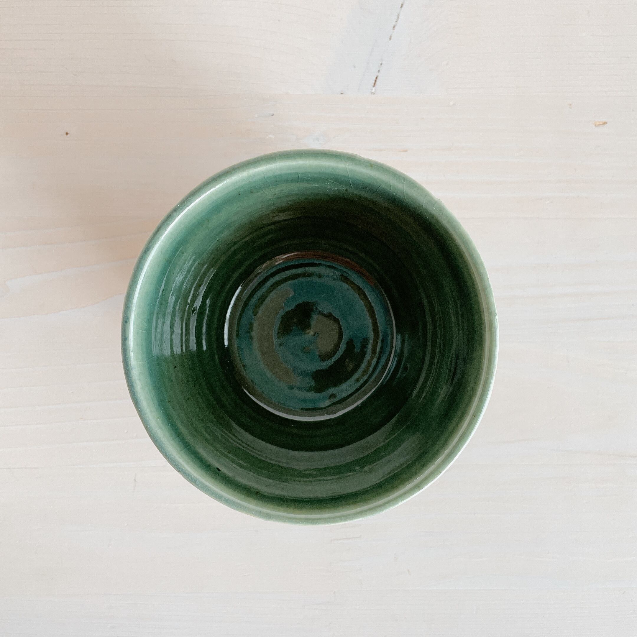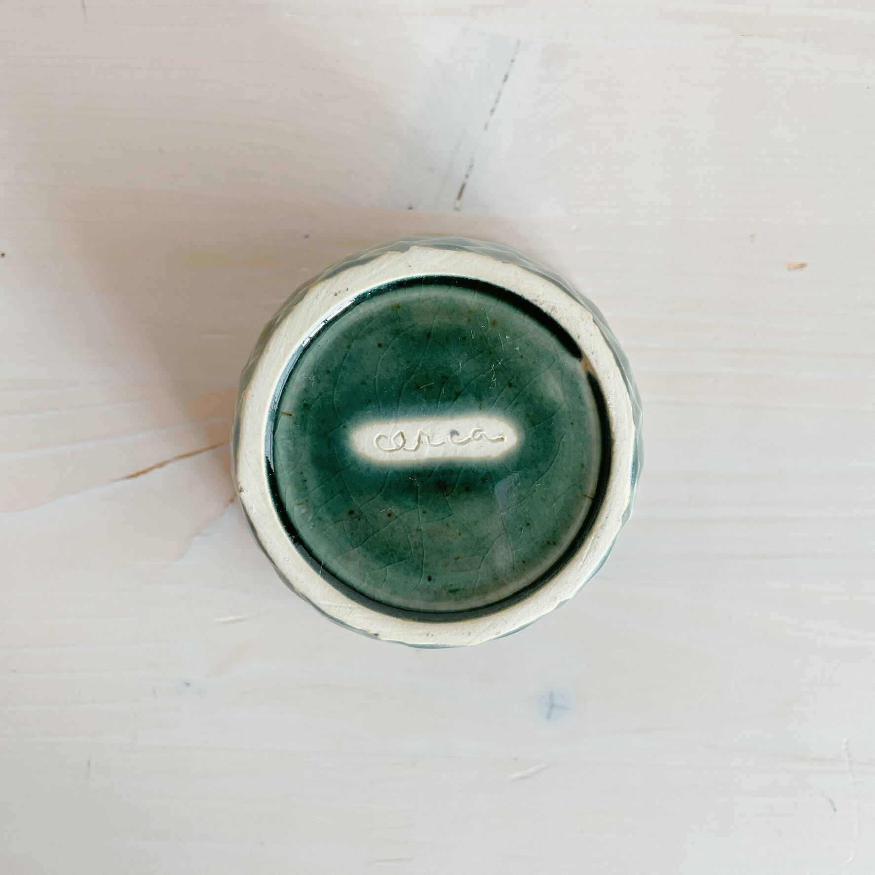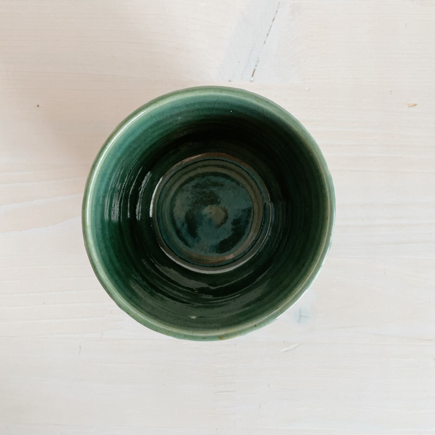 ダークグリーンのダイヤ柄は、大人っぽくどこか都会的ながら、温かい陶器ならではの雰囲気に包まれています。丁寧な手作業によって表面に凹凸を作り、釉薬によってパターンを浮き上がらせる技法を得意とされる、cercaならではの佇まい。手に持つとすっと馴染み、使いやすさも兼ね備えています。
